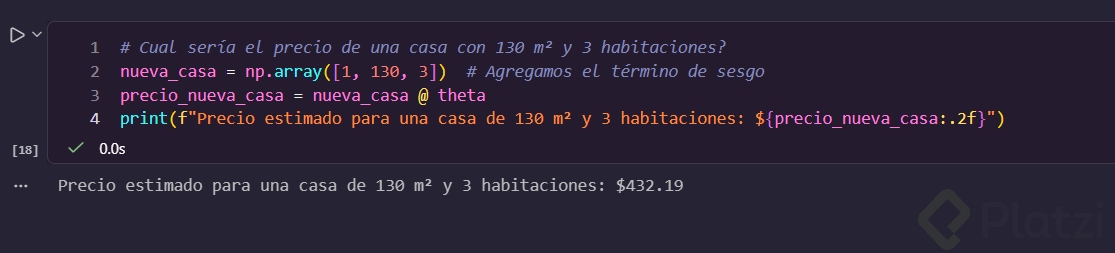 Calcula el precio para una casa de 130 m² con 3 habitaciones. Recuerda incluir el bias al inicio y hacer el producto punto con theta.