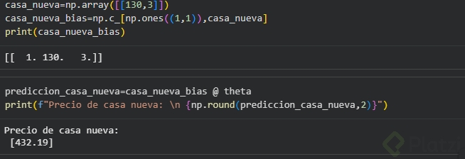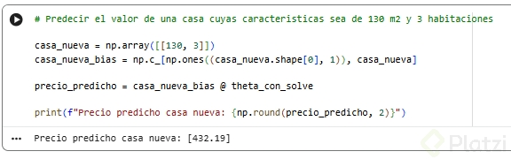 casa = np.array([1,130,3])precio_130_3 = casa @ theta