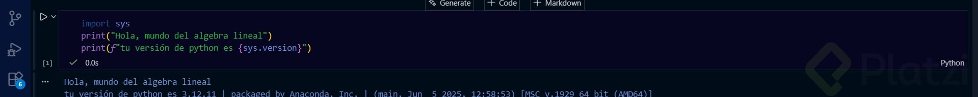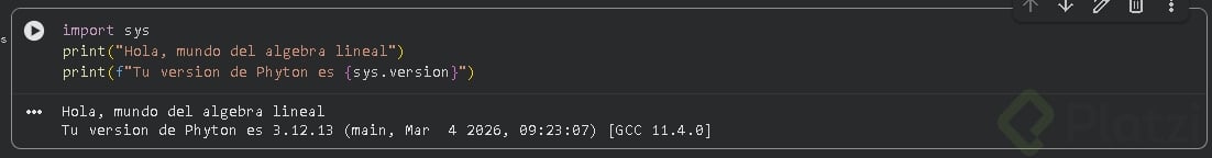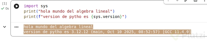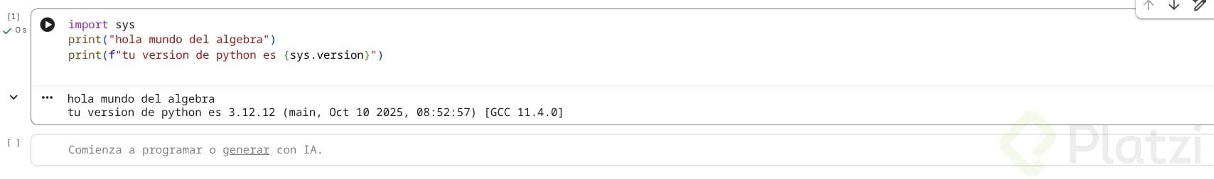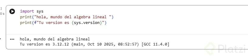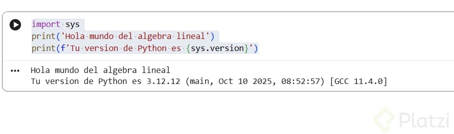 print("Hola mundo del álgebra lineal")print(f"Tu versión de Python es: {sys.version}")
