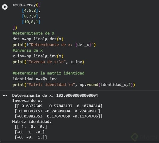 # Inversa de MM_inversa = np.linalg.inv(M)print("Inversa de M:\n", M_inversa)# Comprobación: M @ M_inversa ≈ II_calc = M @ M_inversa