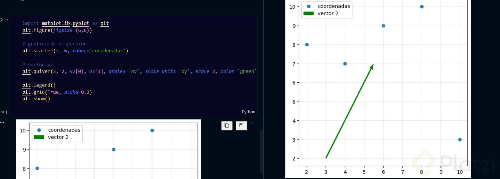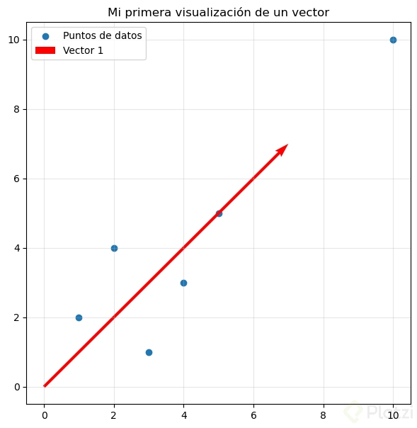Visualizar ayuda a encontrar patrones, detectar errores y comunicar resultados. Con Matplotlib puedes graficar puntos y vectores en un plano cartesiano de forma simple.