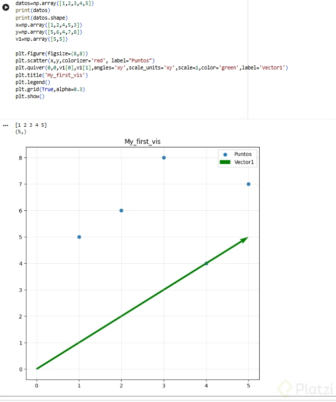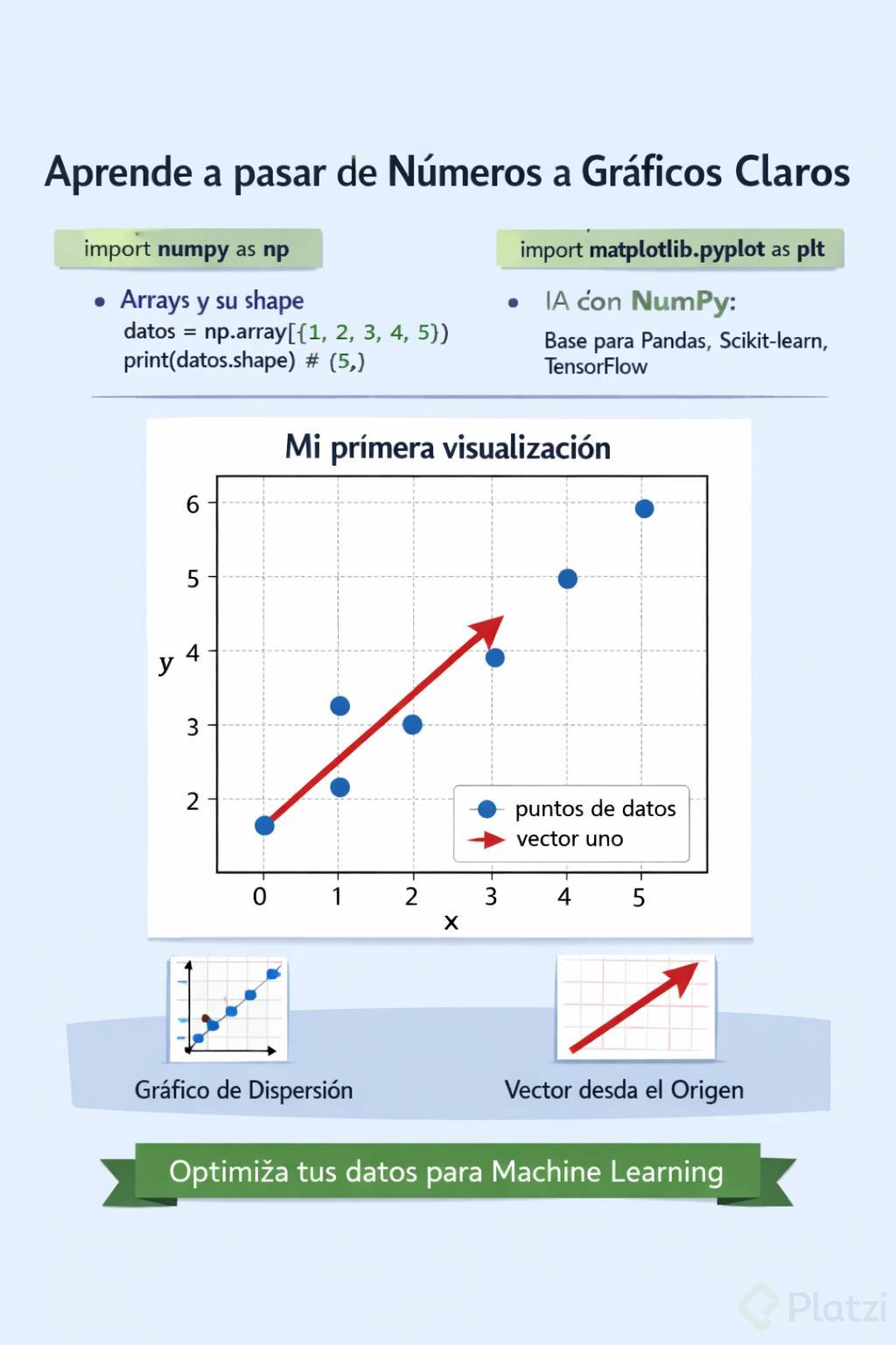 Aprende a pasar de números a gráficos claros en Python con NumPy y Matplotlib. Domina la creación de arrays, interpreta su shape y construye tu primera visualización combinando un gráfico de dispersión y un vector. Todo con buenas prácticas que te ahorran tiempo y errores al preparar datos para machine learning.