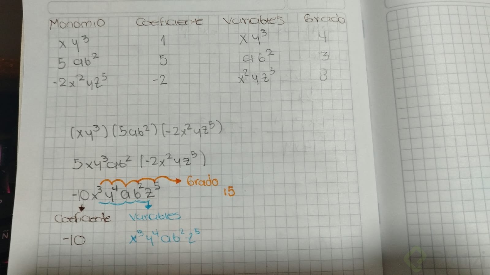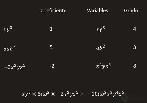 - Coeficiente: número multiplicando directamente a la variable; por ejemplo, en el monomio 5x, el coeficiente es 5.