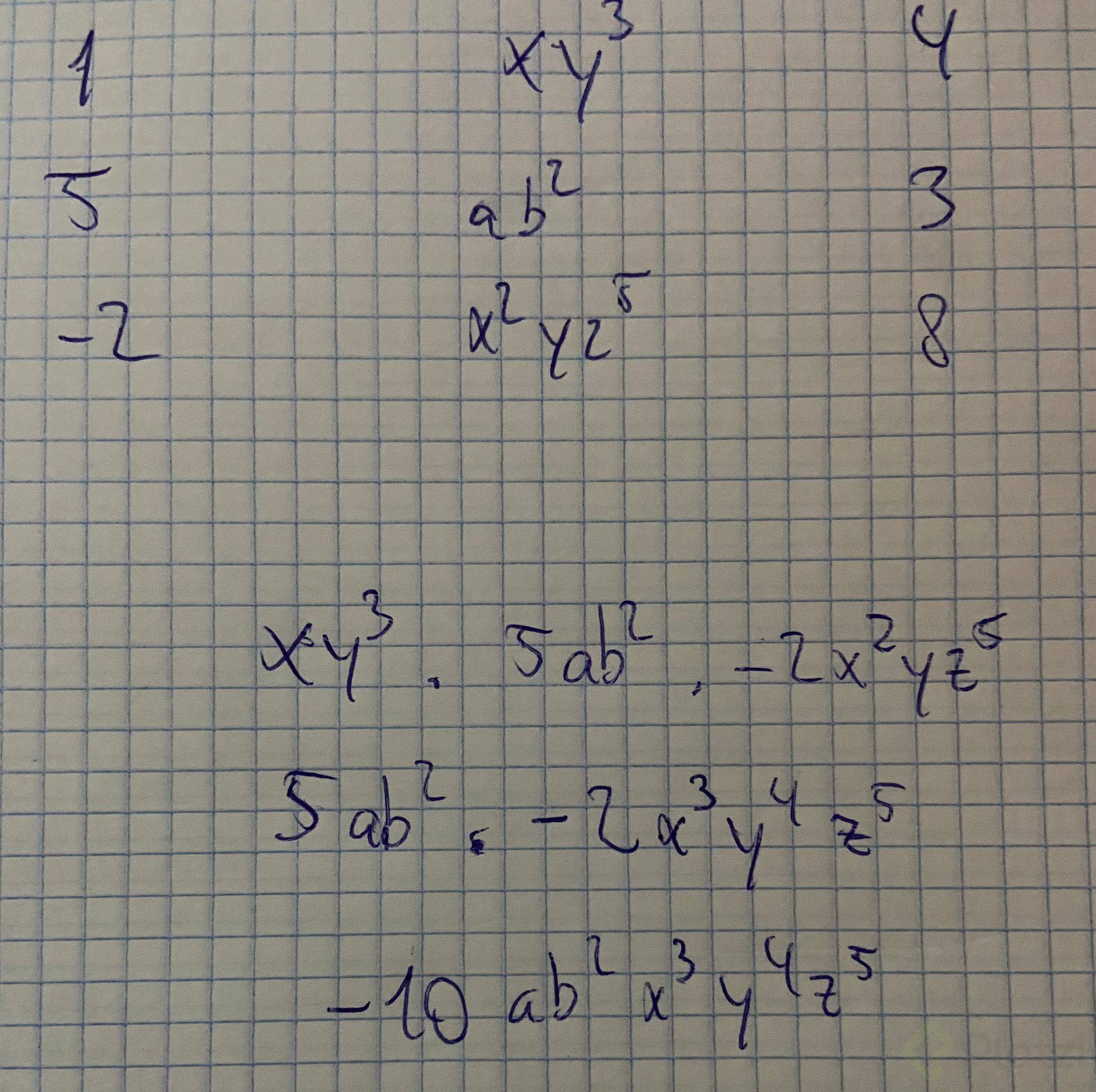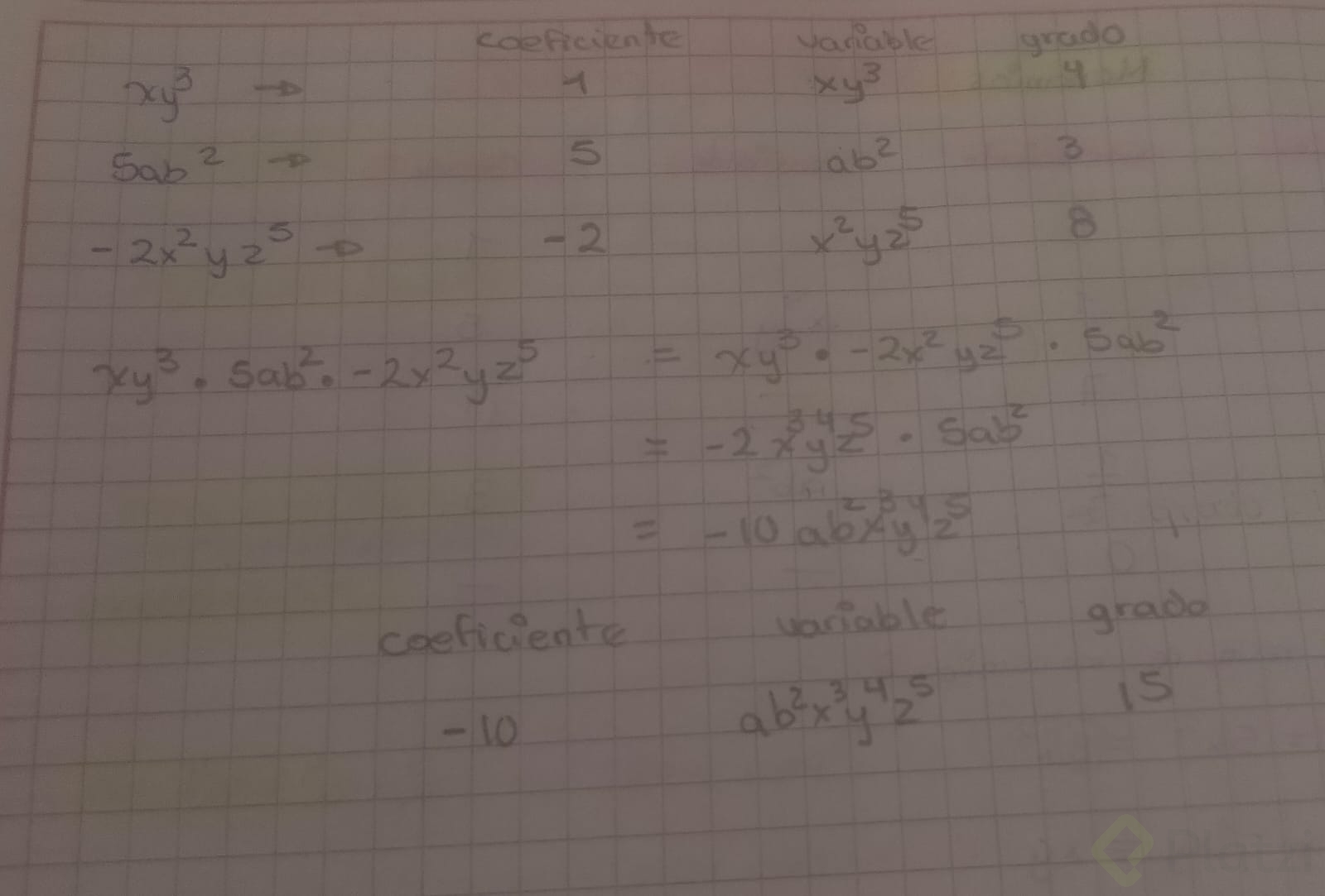 - Menos x^4 y: el coeficiente será -1, variables x⁴ y y¹, y el grado aquí corresponde a la suma de sus exponentes, resultando grado 5.
