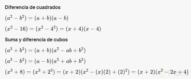 - Suma: (a^3 + b^3 = (a + b)(a^2 - ab + b^2)).