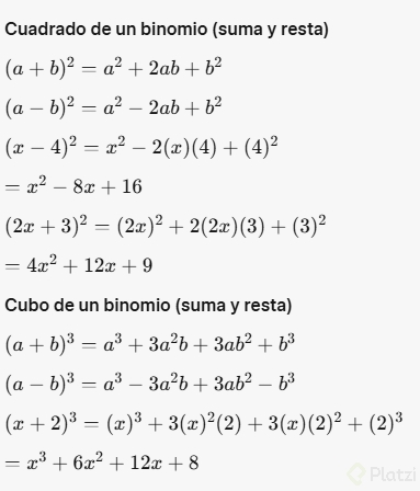 - Resta: ((a - b)^2 = a^2 - 2ab + b^2).