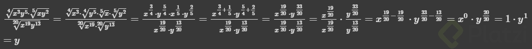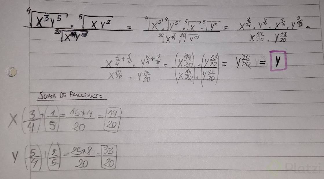 - Multiplicación de raíz quinta de x por raíz quinta de y: