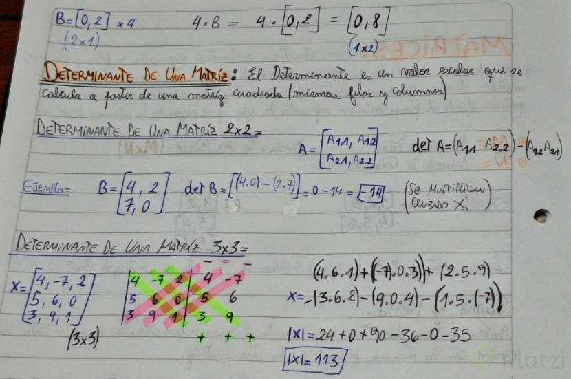 Ejemplo claro: - Matriz X = [elementos indicados en clase]; al simplificar resulta en una determinante calculada de 113.