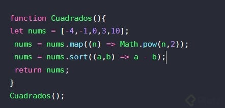 # Entrada: nums = [-4,-1,0,3,10] # Salida: [0,1,9,16,100] # Explicación: Después de elevar al cuadrado, el arreglo se convierte en [16,1,0,9,100]. # Después de ordenar, se convierte en [0,1,9,16,100].