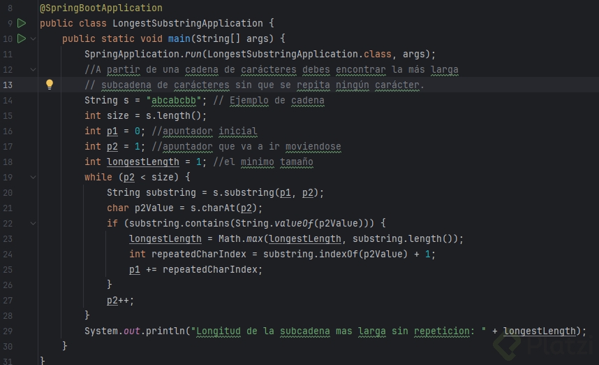 inicio: un apuntador inicializado en cero que ayudará a definir el comienzo de la ventana deslizante que revisaremos.fin: otro apuntador que recorrerá el string, pero que no es necesario inicializar explícitamente al principio, ya que avanzará automáticamente con cada iteración.caracteres_a_posicion: un diccionario que almacenará la posición más reciente de cada carácter en el string.mayor_longitud: un entero que almacenará la longitud del substring más largo encontrado sin caracteres repetidos.