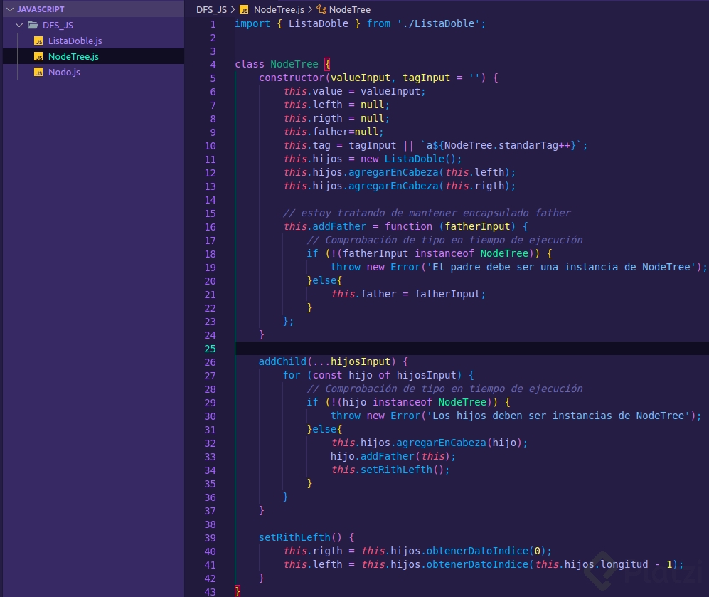 A continuación, se presenta una implementación de DFS en JavaScript para encontrar un número en un árbol. Esta versión recursiva puede ser la base para desarrollos más complejos adaptados a diferentes estructuras de datos.