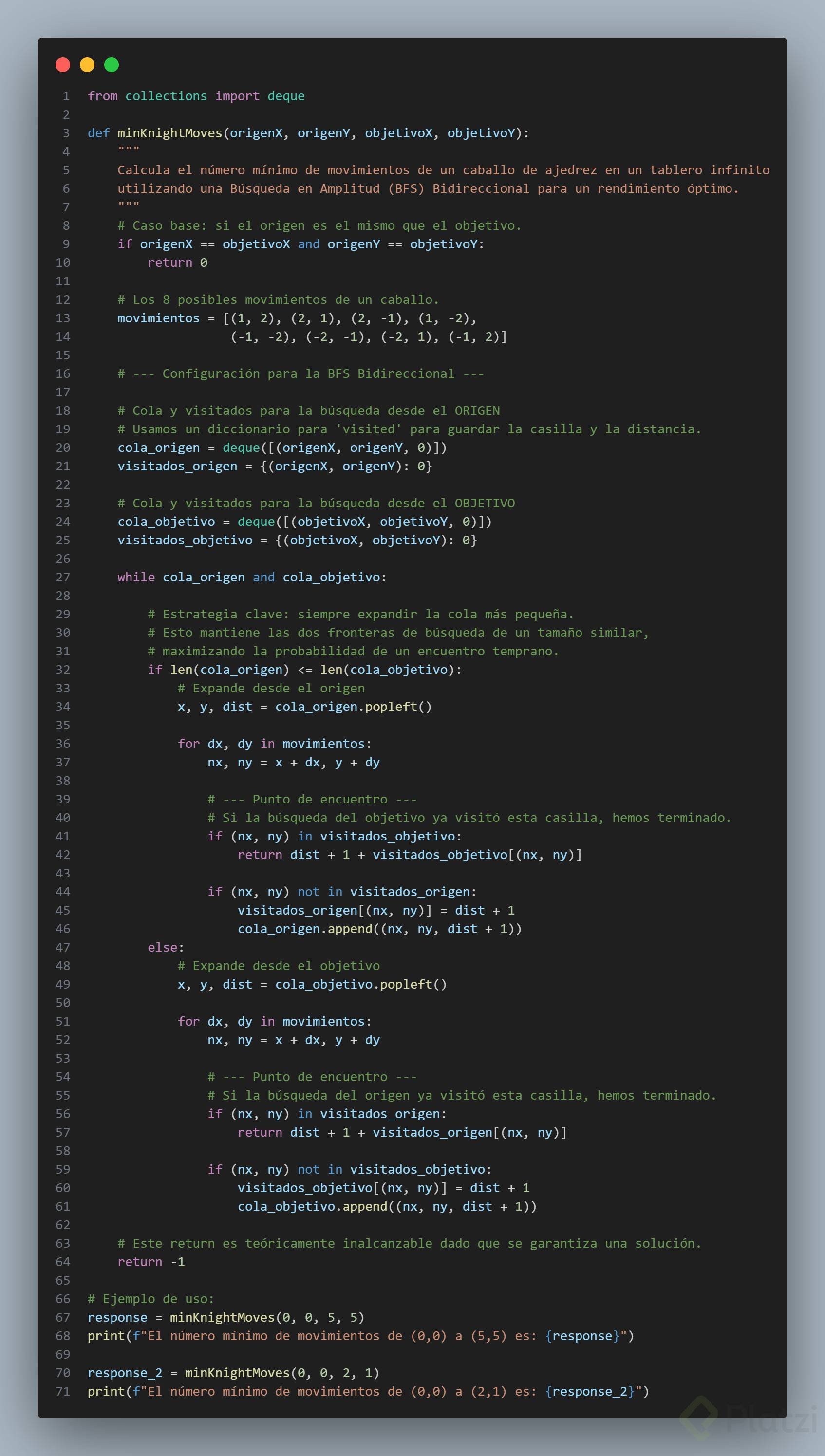 Primero, comprendamos lo que vamos a resolver. La esencia de nuestro problema es determinar la forma correcta de aplicar BFS utilizando una estructura de datos con Python. La función principal recibe cuatro parámetros: origenX, origenY, objetivoX y objetivoY, que representan las coordenadas de inicio y objetivo de nuestro caballero en un tablero de ajedrez.