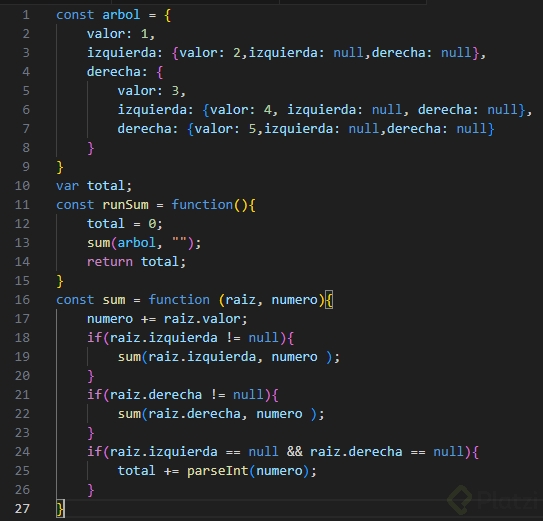 Al trabajar con un árbol binario, el objetivo puede ser, por ejemplo, calcular la suma de todos los caminos desde la raíz hasta las hojas. Este total iniciará en cero, y si la raíz es nula, simplemente retornamos cero.