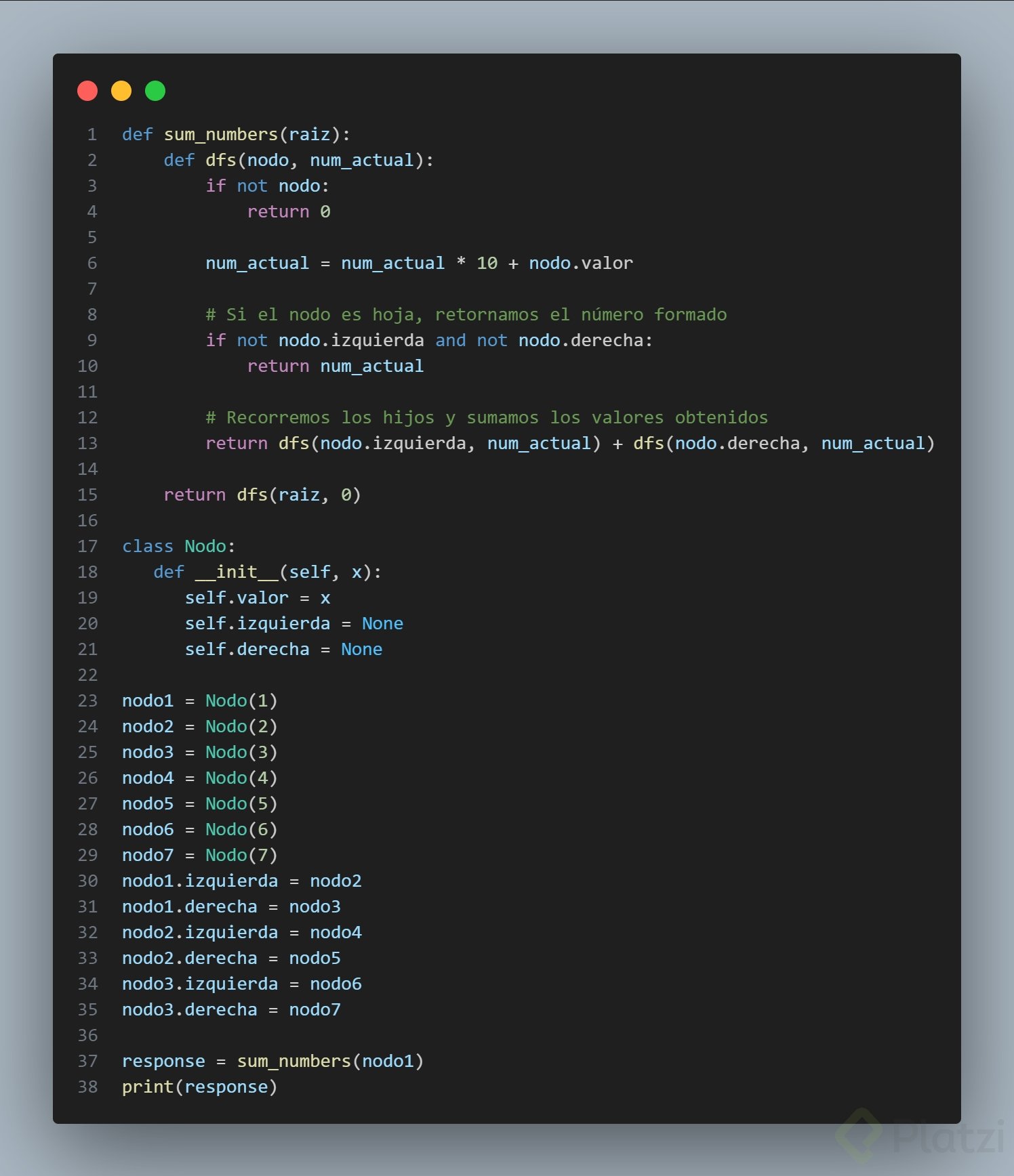 Depth-First Search (DFS) es una técnica popular para explorar o recorrer estructuras de datos como grafos y árboles. En este contexto, creamos la función DFS que recibe el nodo actual del árbol, una cadena que representa el camino actual y el total hasta el momento.