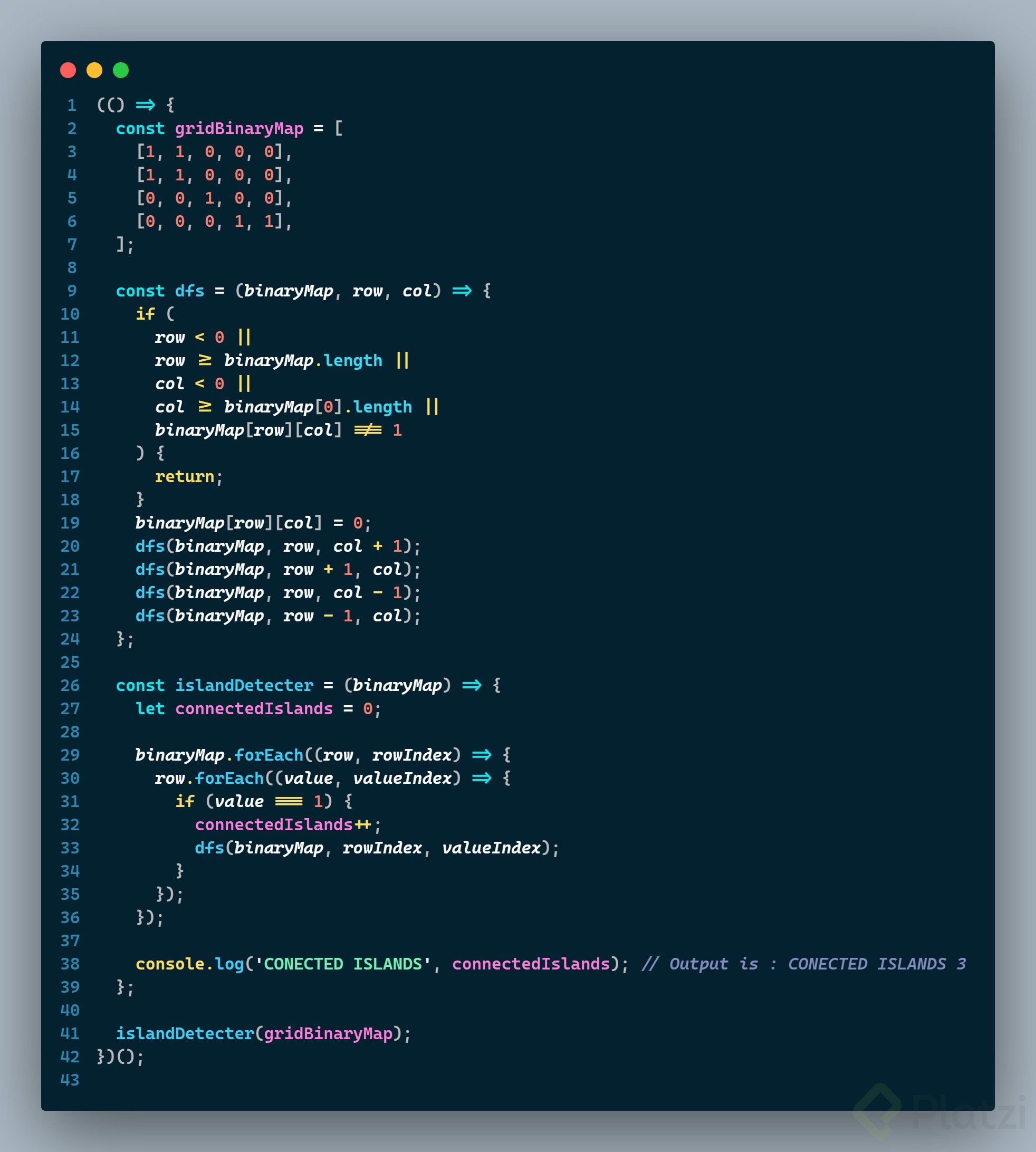 Para resolver este problema, una solución efectiva es usar la búsqueda en profundidad (DFS). Este algoritmo permite explorar completamente cada conjunto de tierra, utilizando una función recursiva que se mantiene mientras haya tierra para recorrer.