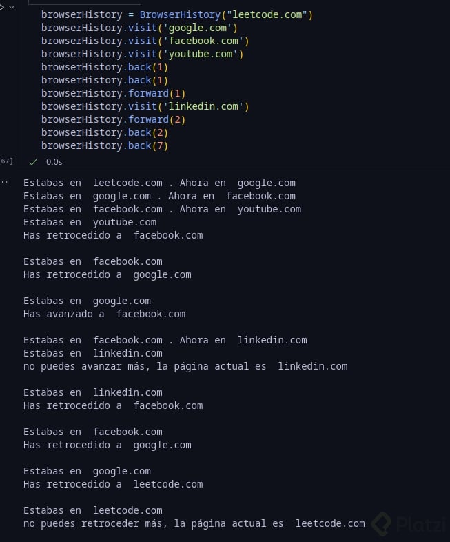 BrowserHistory browserHistory = new BrowserHistory("leetcode.com"); browserHistory.visit("google.com"); // Estás en "leetcode.com". Visita "google.com" browserHistory.visit("facebook.com"); // Estás en "google.com". Visita "facebook.com" browserHistory.visit("youtube.com"); // Estás en "facebook.com". Visita "youtube.com" browserHistory.back(1); // Estás en "youtube.com", vuelve a "facebook.com" retornas "facebook.com" browserHistory.back(1); // Estás en "facebook.com", vuelve a "google.com" retornas "google.com" browserHistory.forward(1); // Estás en "google.com", avanza hasta "facebook.com" return "facebook.com" browserHistory.visit("linkedin.com"); // Estás en "facebook.com". Visita "linkedin.com" browserHistory.forward(2); // Estás en "linkedin.com", no puedes avanzar ningún paso. browserHistory.back(2); // Estás en "linkedin.com", retrocede dos pasos a "facebook.com" y luego a "google.com". devuelve "google.com" browserHistory.back(7); // Estás en "google.com", puedes retroceder sólo un paso hasta "leetcode.com". Retornas "leetcode.com"