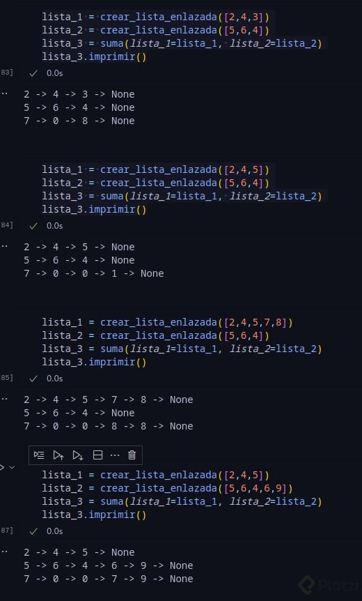 Se dan dos listas enlazadas no vacías que representan dos enteros no negativos. Los dígitos están almacenados en orden inverso, y cada uno de sus nodos contiene un solo dígito. Suma los dos números y devuelve la suma como una lista enlazada.