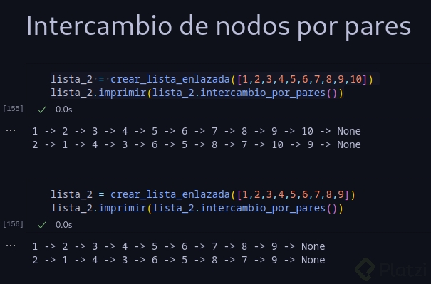Ejemplo 1: Entrada: cabeza = [1,2,3,4] Salida: [2,1,4,3]