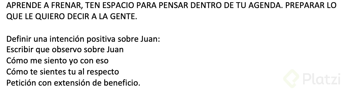 El cuarto paso es preguntar y escuchar cómo se siente la otra persona respecto a la situación. Tal vez, Juan revele que la acumulación de conflictos en su agenda es la causa de su falta de preparación. Este diálogo genuino ayuda a crear empatía y es el primer paso para construir soluciones colaborativas. Al entender su perspectiva, podemos trabajar juntos para encontrar medidas efectivas.