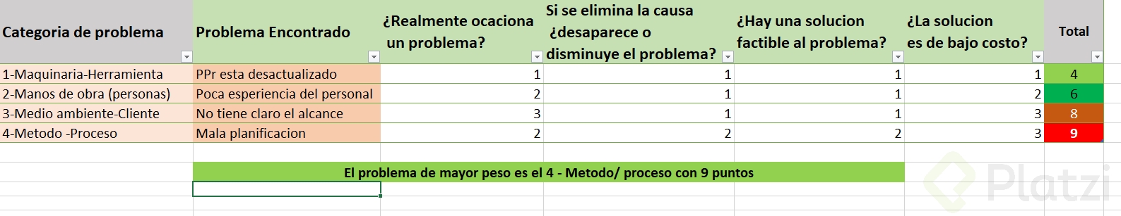 Asignar pesos: Utilizar una escala del 1 al 3, donde 1 es menor peso y 3 es mayor peso. Cada causa se evalúa y suma para identificar la más relevante.