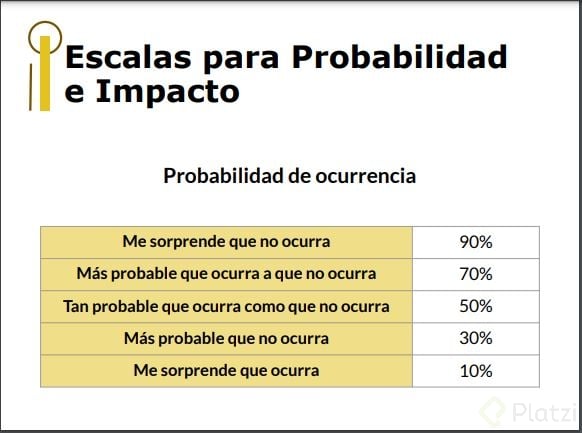 Evaluación de probabilidades: Se debe definir cómo de probable es que cada riesgo ocurra, basándose en datos históricos y experiencia del equipo, con porcentajes asignados del 10%, 30%, 50%, 70% o 90%.