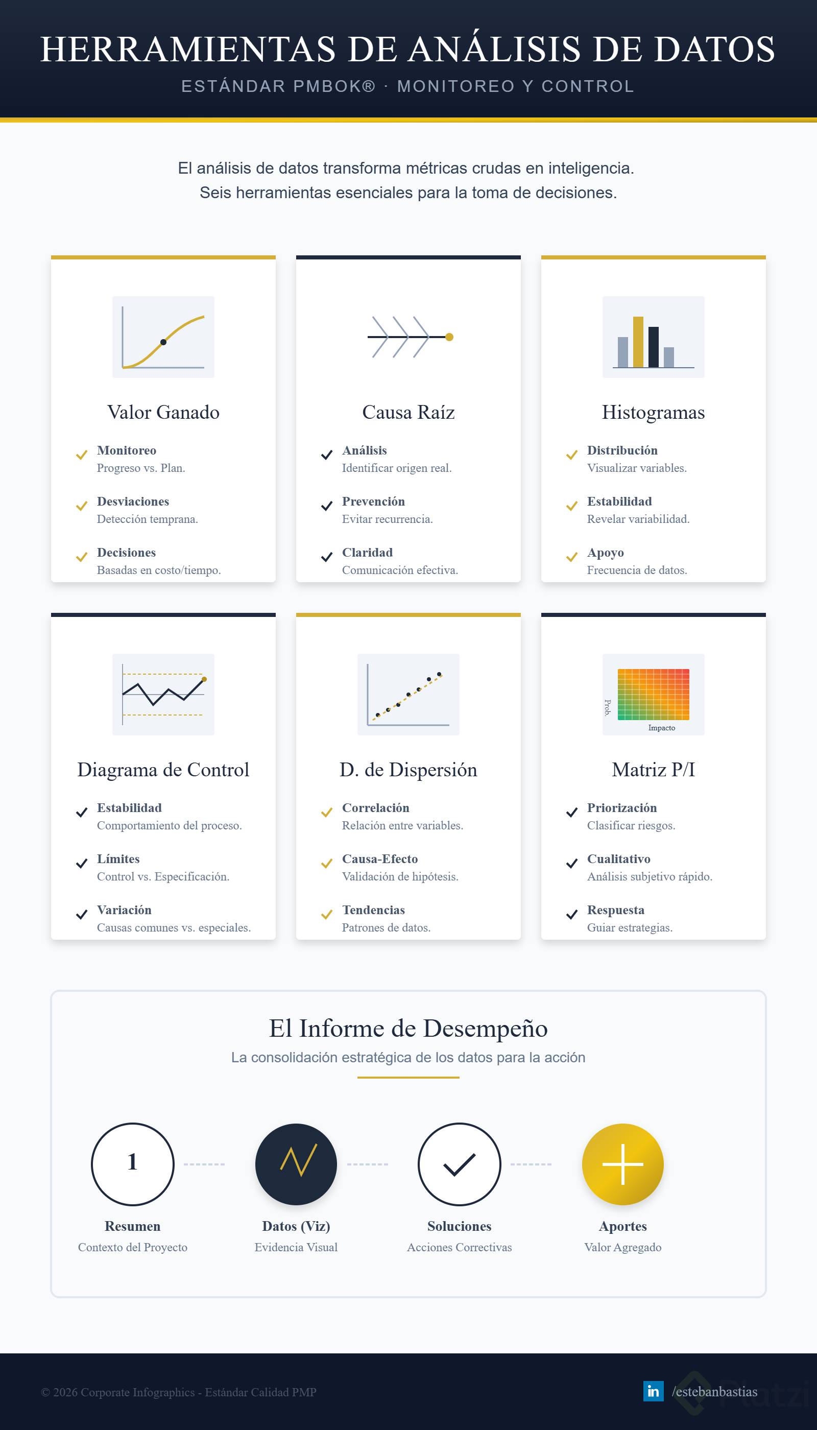 En el mundo de la gestión de proyectos, el monitoreo y control efectivo son esenciales para el éxito. A lo largo de este curso, hemos explorado una serie de herramientas de análisis de datos que son clave para optimizar estos procesos. Herramientas como el valor ganado, diagramas de causa raíz, histogramas, diagramas de control y más, no solo facilitan el seguimiento de proyectos, sino que también potencian la capacidad para tomar decisiones informadas. Ahora, es el momento de consolidar ese conocimiento y aplicarlo de manera práctica y estratégica. ¡Vamos a ahondar en cómo estas herramientas pueden transformar la forma en que gestionas tus proyectos!