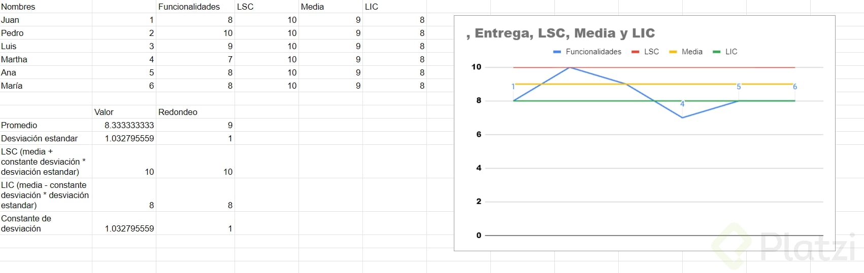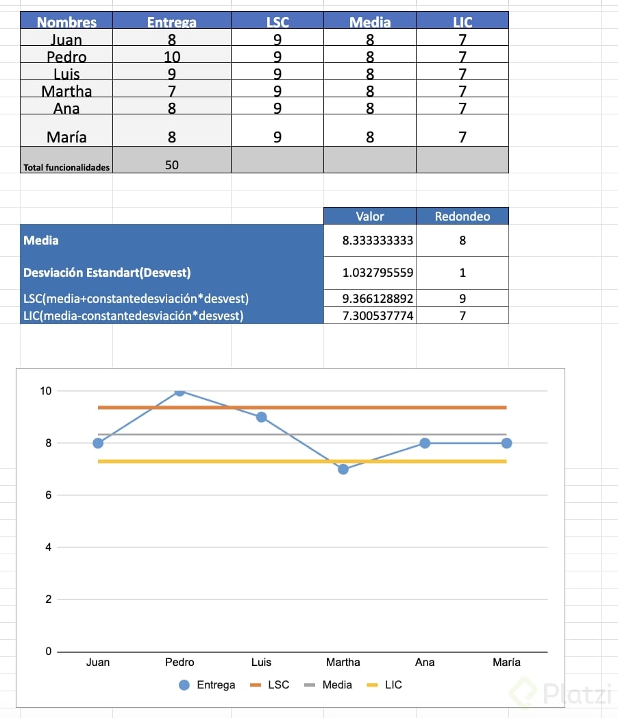 - Recopilación de datos: Cada uno recibió diez funcionalidades de igual dificultad. Los datos de entregas fueron variados: Juan entregó 5, Pedro 10, Luis 8, Marta 9, Ana 8, y María 7.
