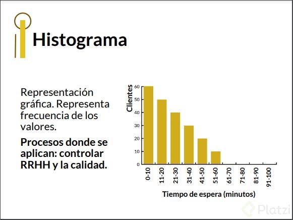 El histograma es una representación gráfica que ilustra la frecuencia de un evento o conjunto de datos. Nos permite visualizar patrones o tendencias, como la cantidad de clientes atendidos en intervalos de tiempo específicos. Esta herramienta es particularmente valiosa en el control de recursos humanos y calidad, ayudando a la identificación de áreas de mejora continua en los procesos.