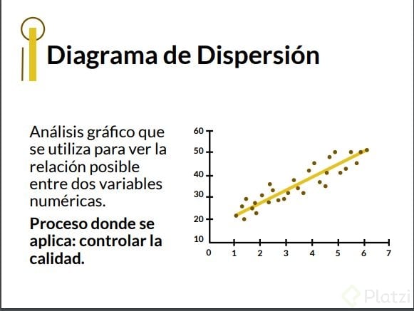 Este diagrama permite la visualización de la relación entre dos variables a través de un análisis gráfico. Si existe una correlación, se puede trazar una línea que ayude a establecer una fórmula o relación entre las variables estudiadas. Este método es esencial en el control de calidad, facilitando la comprensión de cómo diferentes factores interactúan y afectan el resultado final de un proceso.