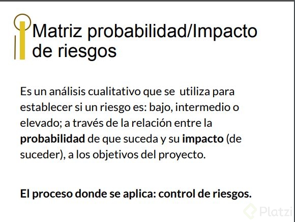 La matriz de probabilidad e impacto nos permite realizar un análisis cualitativo de riesgos, determinando si el riesgo es bajo, medio o alto. Este análisis se realiza multiplicando la probabilidad de ocurrencia del riesgo por el impacto que este podría tener en el proyecto. Es una herramienta clave en el control de riesgos, ayudando a priorizar acciones y enfocarnos en los riesgos más críticos para el éxito del proyecto.