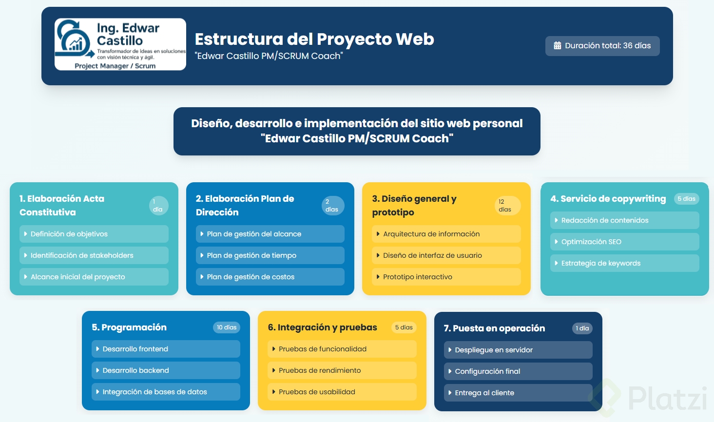 Cuando se está al mando de un proyecto, la fase de monitoreo y control es crucial para su éxito. Este módulo se centra en el desarrollo de un sitio web personal profesional con el objetivo de amplificar la visibilidad de los servicios del cliente tanto a nivel nacional como internacional. Dentro de este marco, asumirás el rol de director de proyecto, velando por el cumplimiento de los requisitos y el correcto desarrollo del mismo. La misión es asegurar un desempeño óptimo y resolver cualquier inconveniente que surja en el camino.