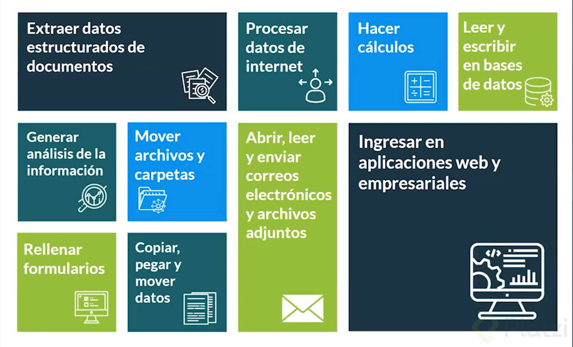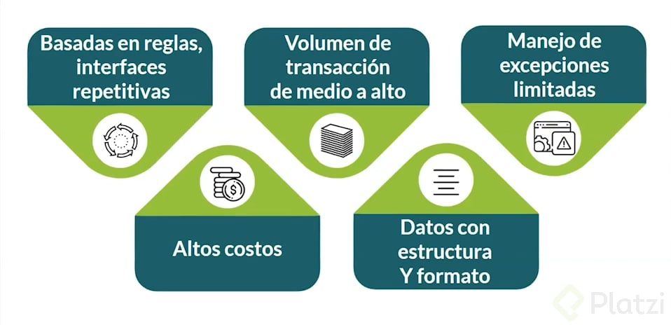 - Basado en reglas: Procesos que sigan reglas predefinidas son fácilmente automatizables.