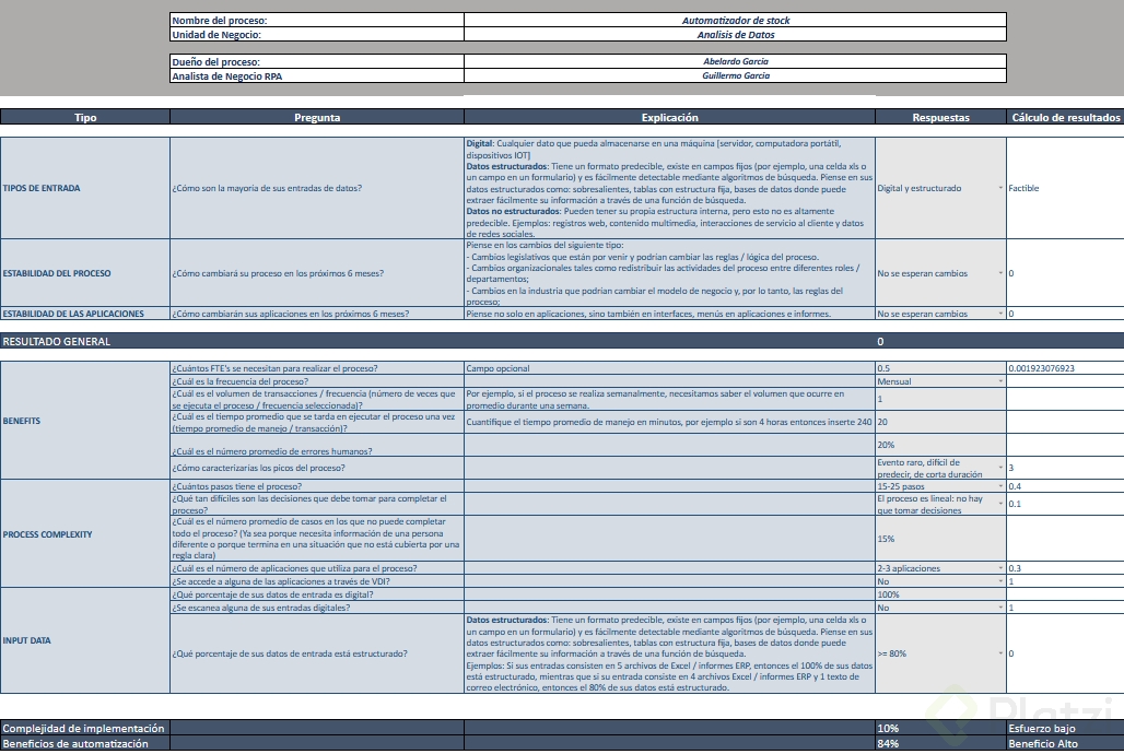- Beneficios esperados: Calcula el tiempo y esfuerzo humanos que ahorrará la automatización. Mayor a 1, los beneficios tienden a ser significativos.