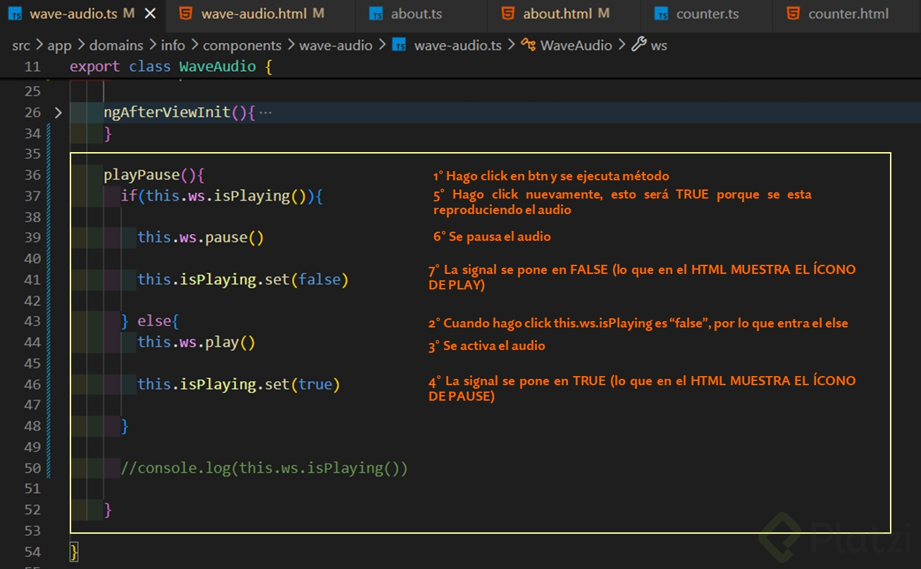 - Alternar el texto del botón entre 'Play' y 'Pause' basado en el estado de la reproducción.