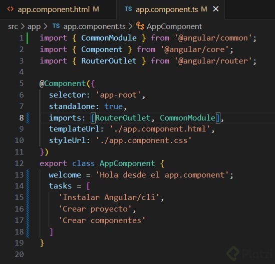 ng servepara ver los cambios en tiempo real. - Introducción a la lógica de negocios: Aprendes cómo conectar tu componente de Angular con el HTML manipulando variables y estructuras de control como