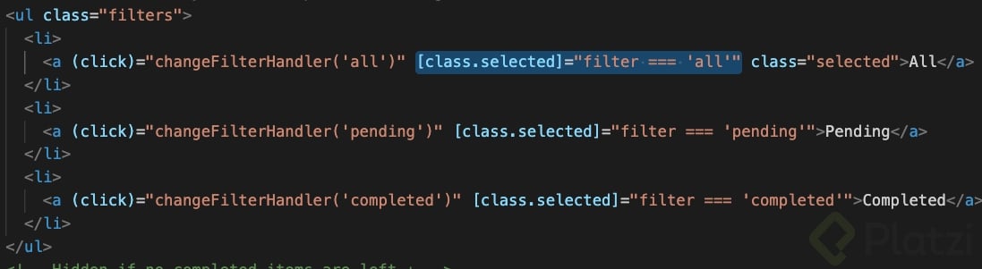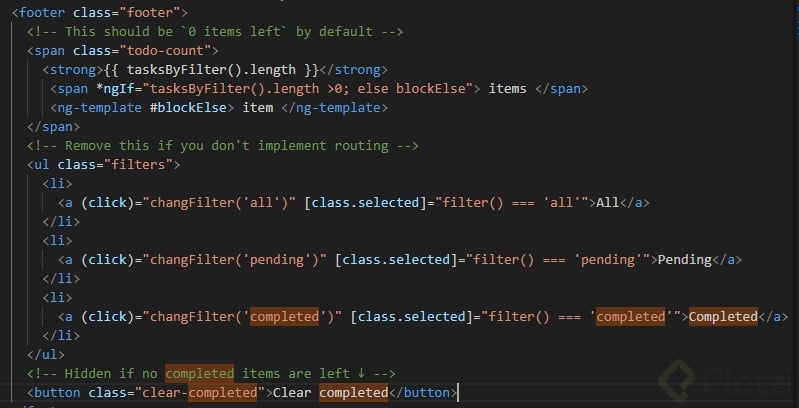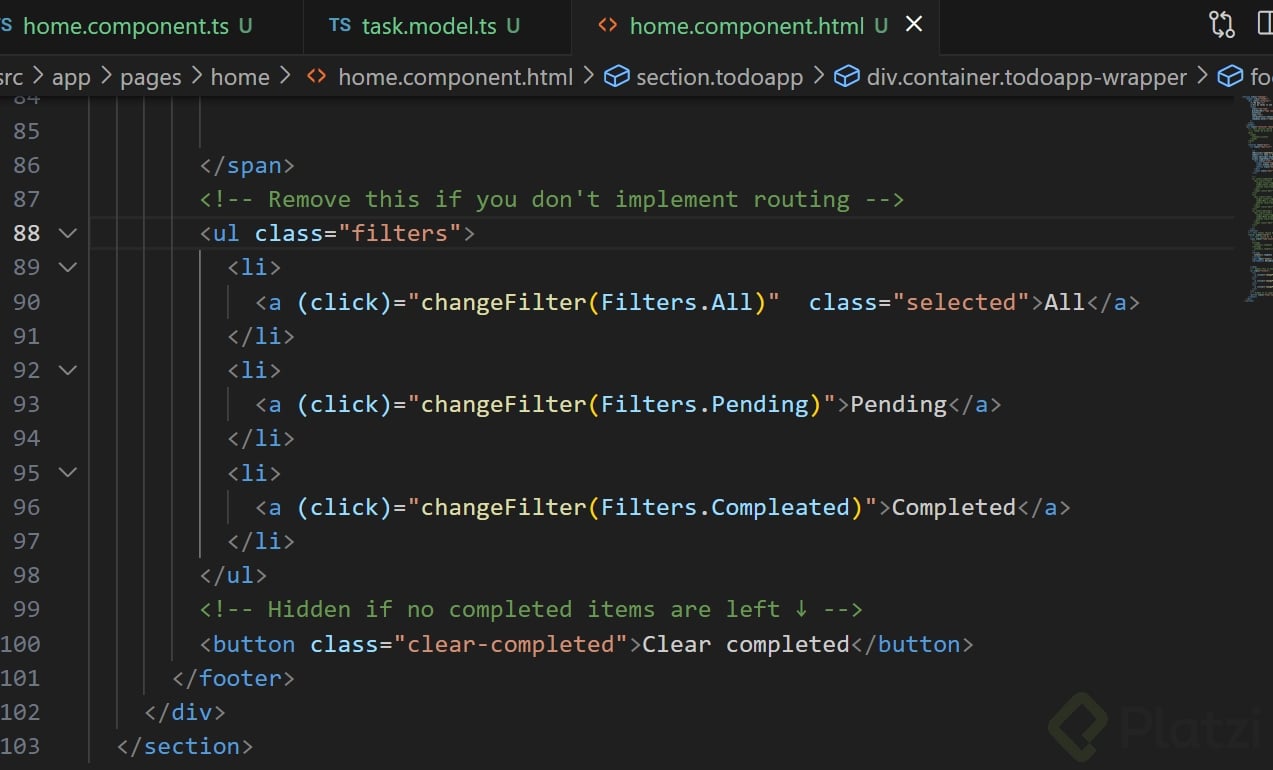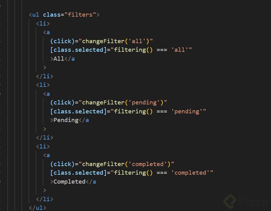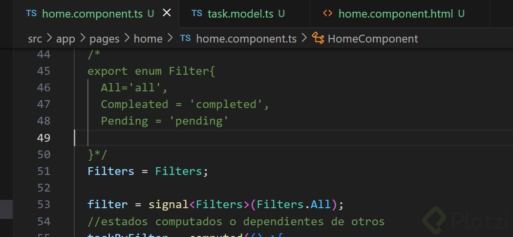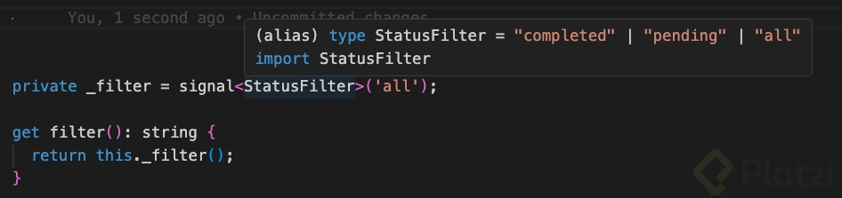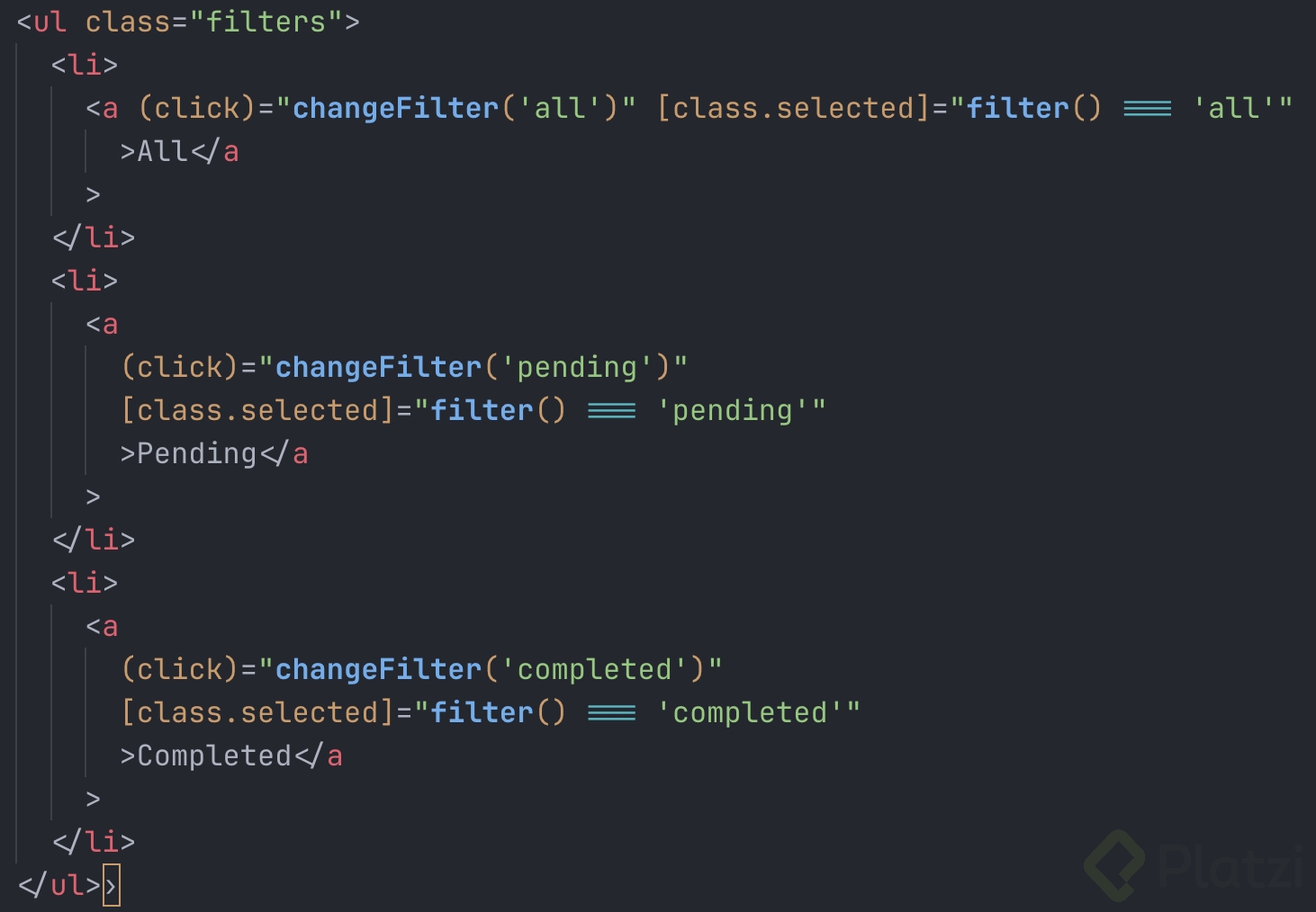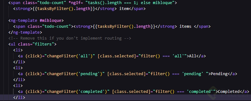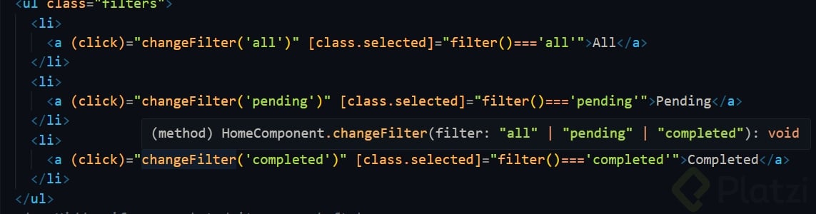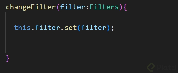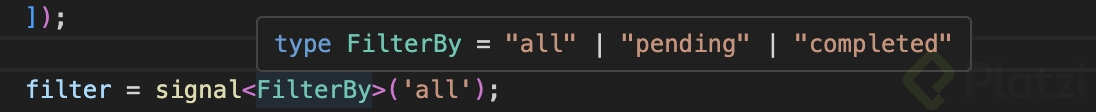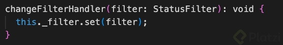 Definir el estado del filtro: Comience creando un Signal para manejar el estado del filtro. Puede establecerse como un string con valores predeterminados como 'All', 'Pending' o 'Completed'.