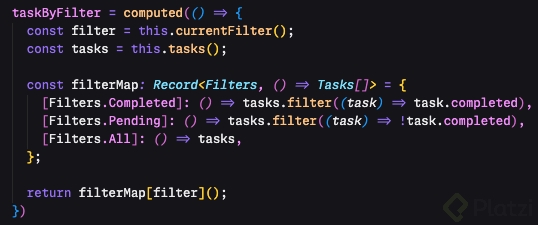 const tasksByFilter = computed(() => { const currentFilter = filterState(); const allTasks = tasks(); switch (currentFilter) { case 'Pending': return allTasks.filter(task => !task.completed); case 'Completed': return allTasks.filter(task => task.completed); default: return allTasks; } });
