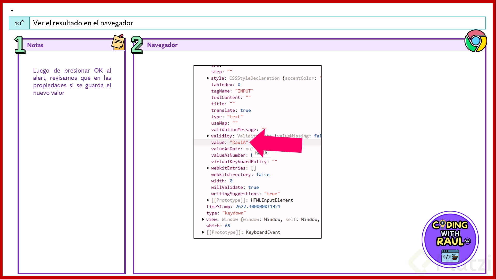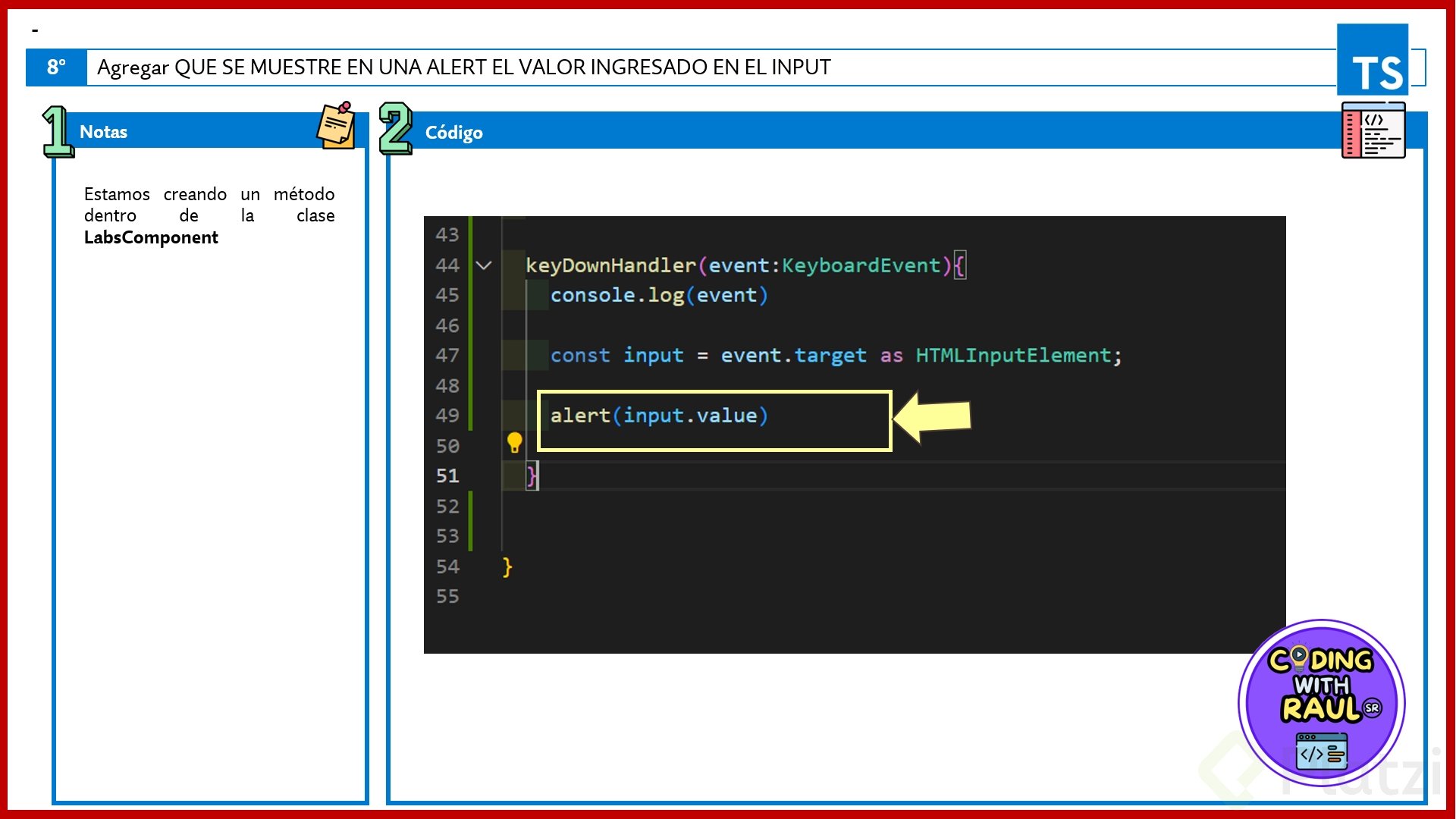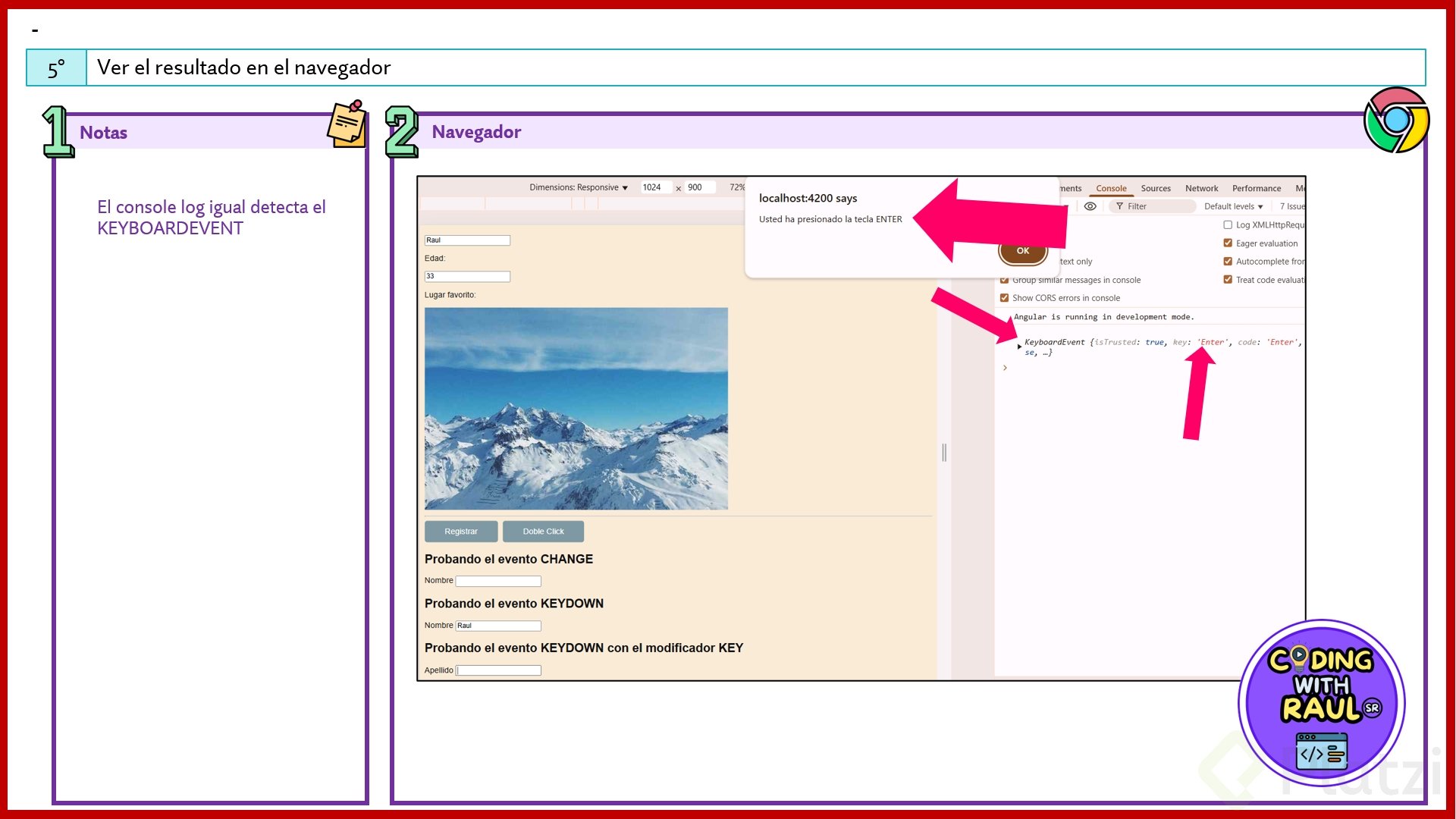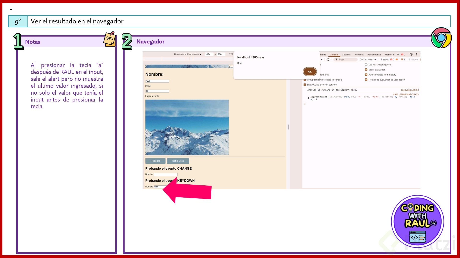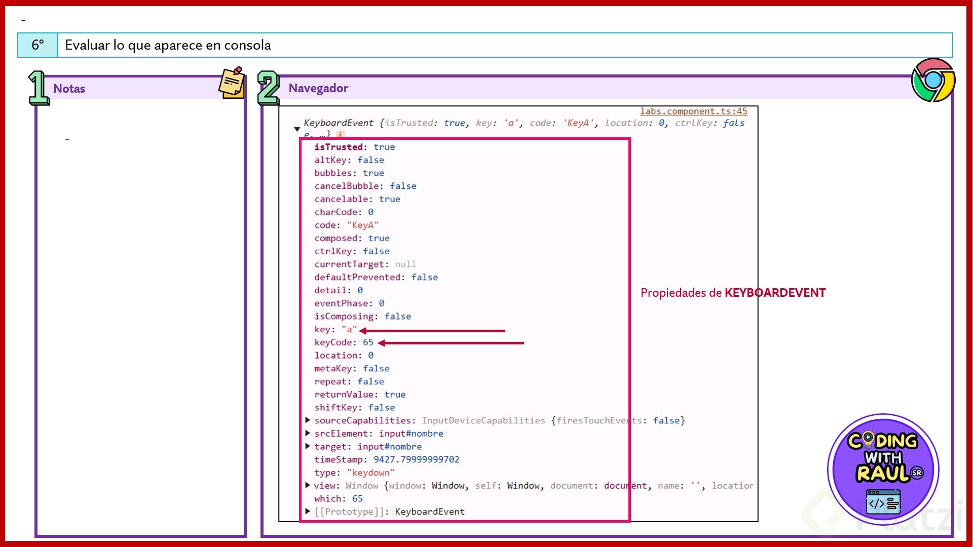 En este código, cada vez que se presione una tecla, se capturará el evento y se imprimirá en consola la tecla presionada y el valor actual del campo donde se está escribiendo.