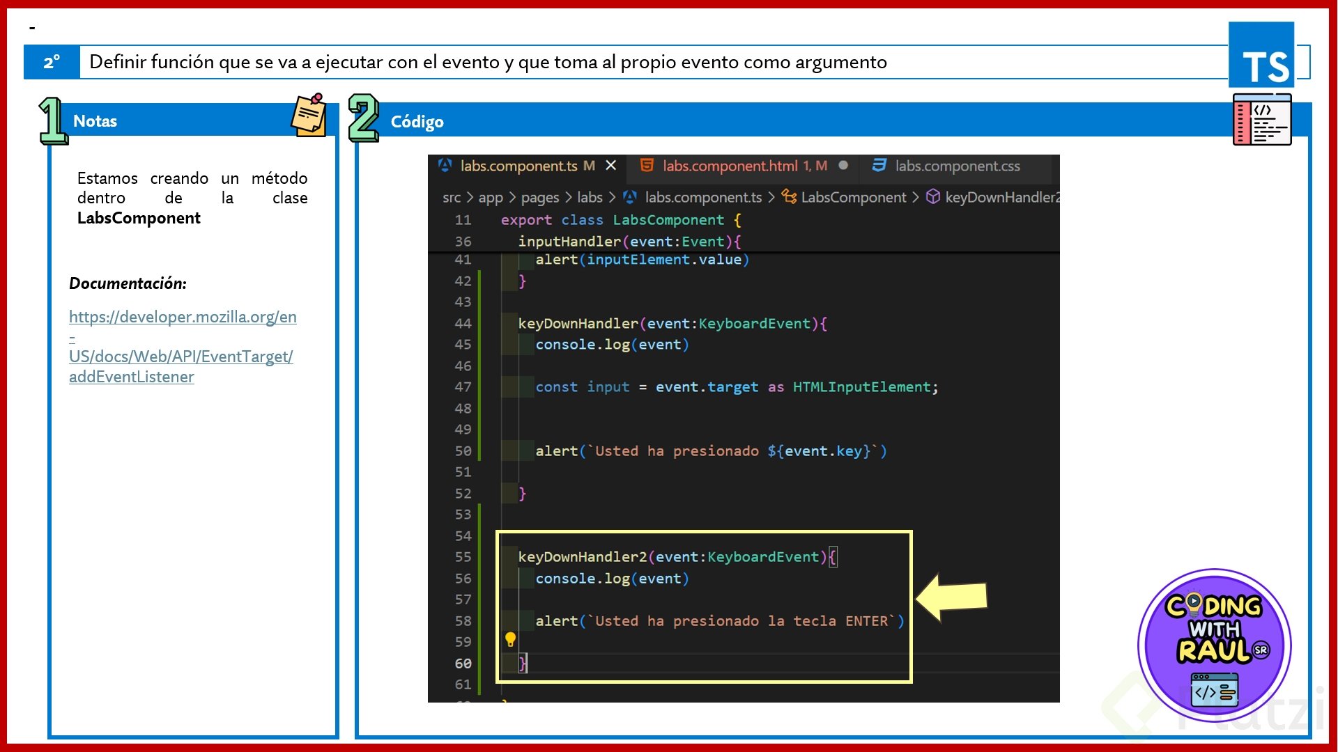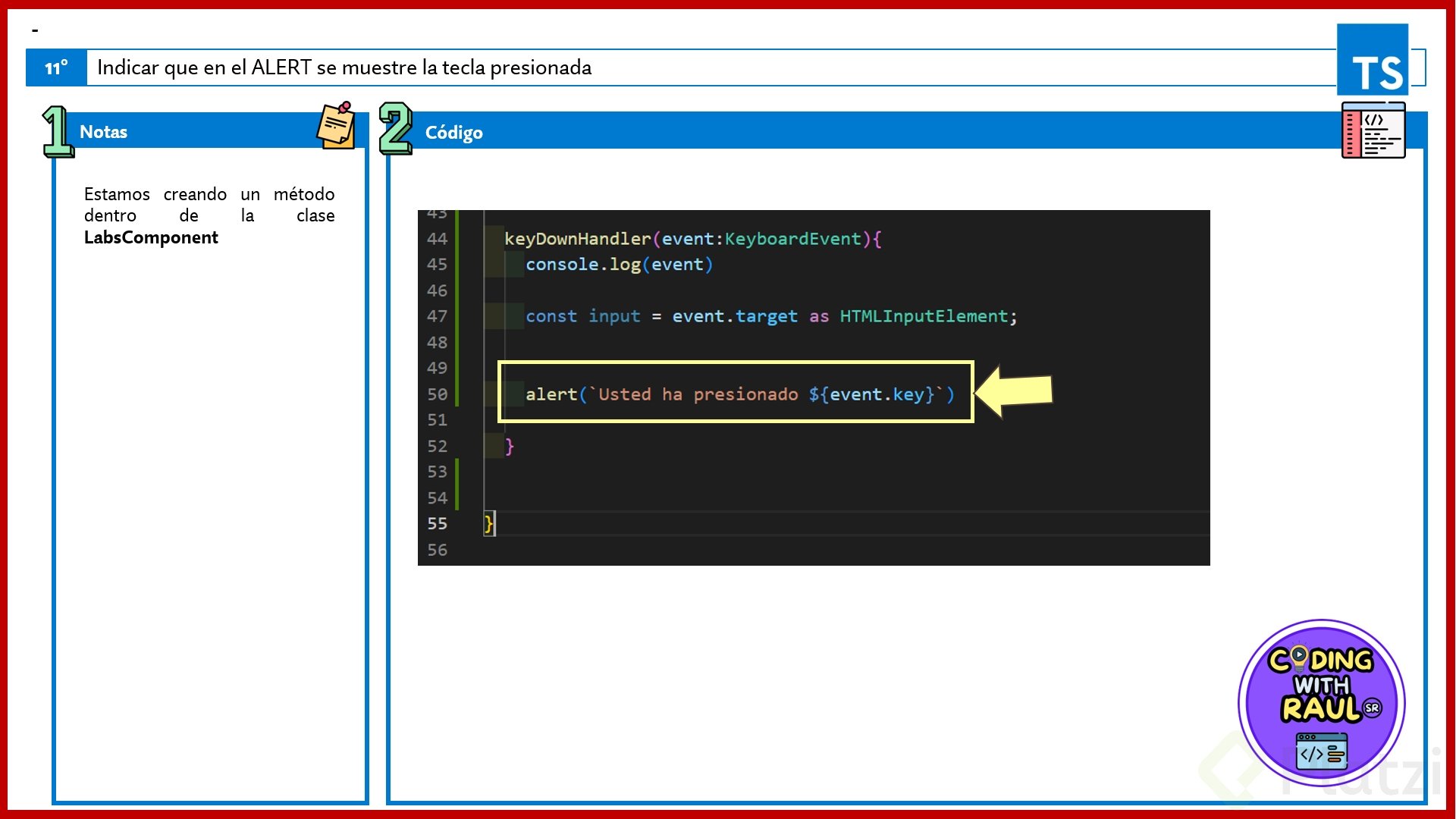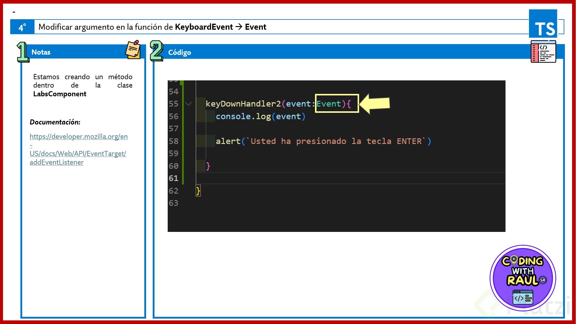 Veamos un ejemplo de uso del evento keydown en un entorno de programación, utilizando TypeScript y Angular como caso de estudio. La siguiente función maneja el evento de keydown, logrando capturar detalles como qué tecla fue presionada y sobre qué elemento se efectuó la acción: