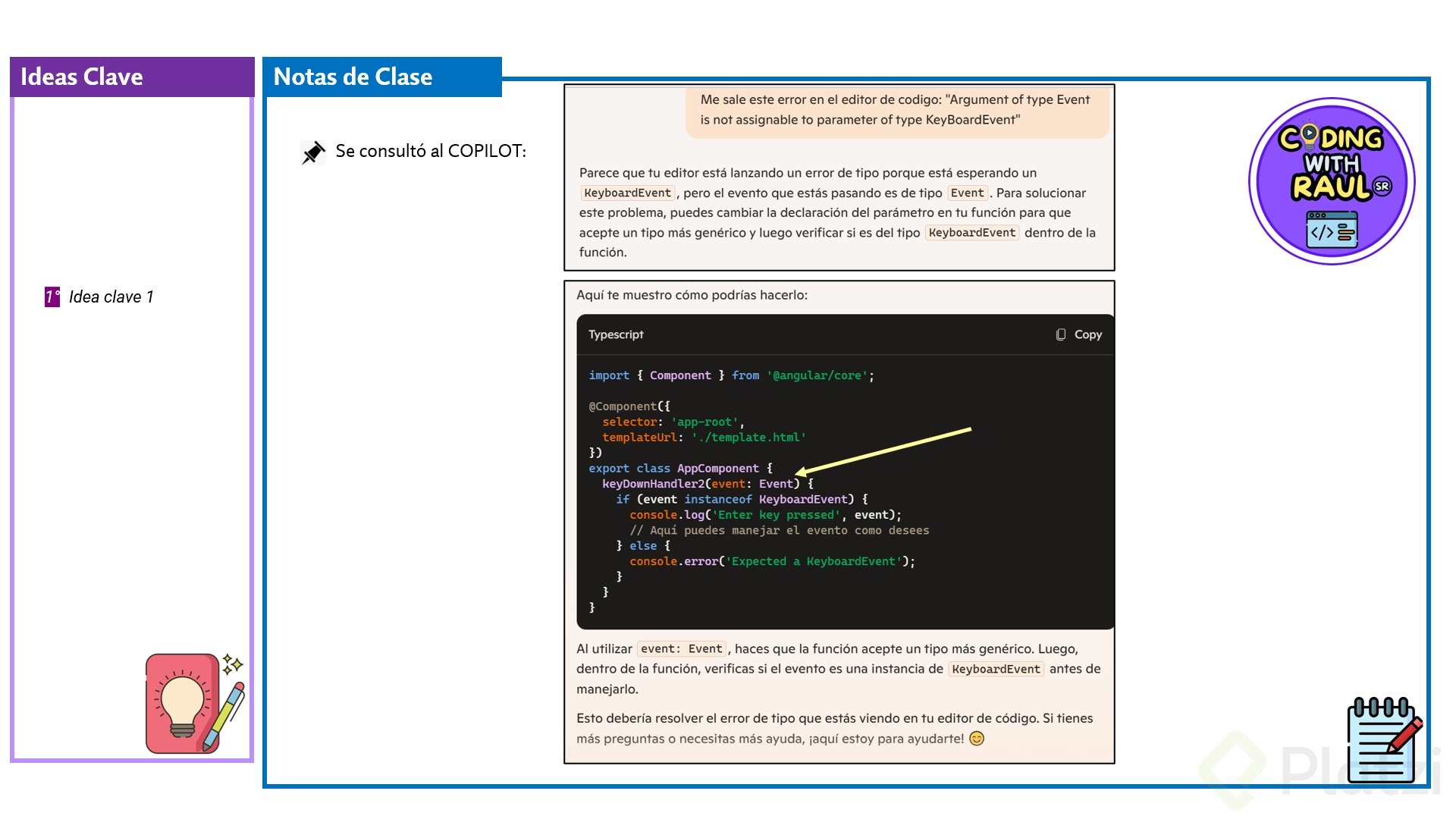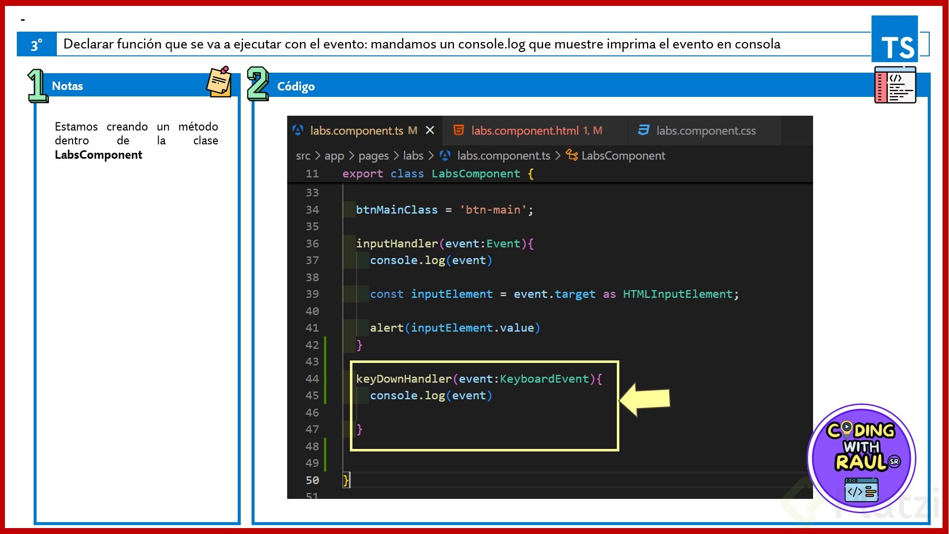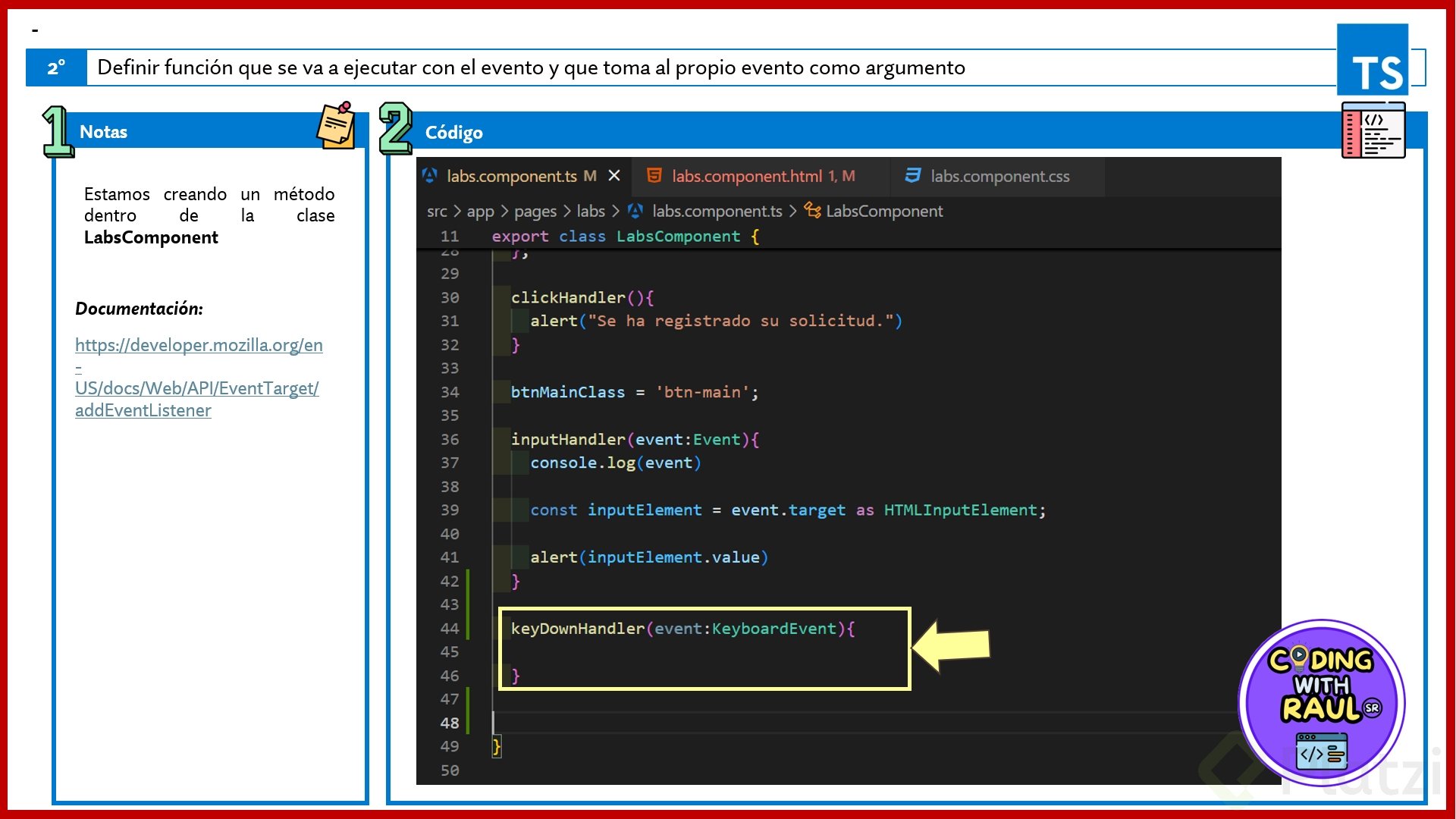 Veamos un ejemplo de uso del evento keydown en un entorno de programación, utilizando TypeScript y Angular como caso de estudio. La siguiente función maneja el evento de keydown, logrando capturar detalles como qué tecla fue presionada y sobre qué elemento se efectuó la acción: