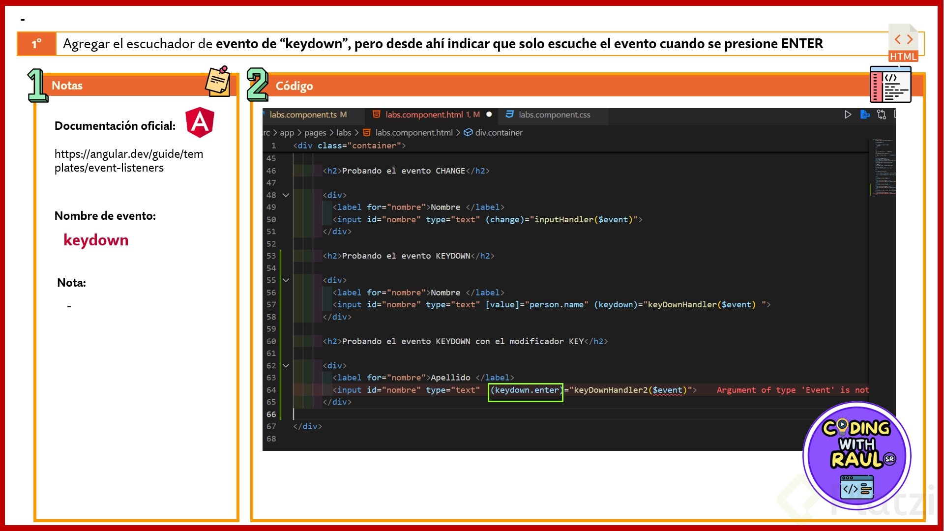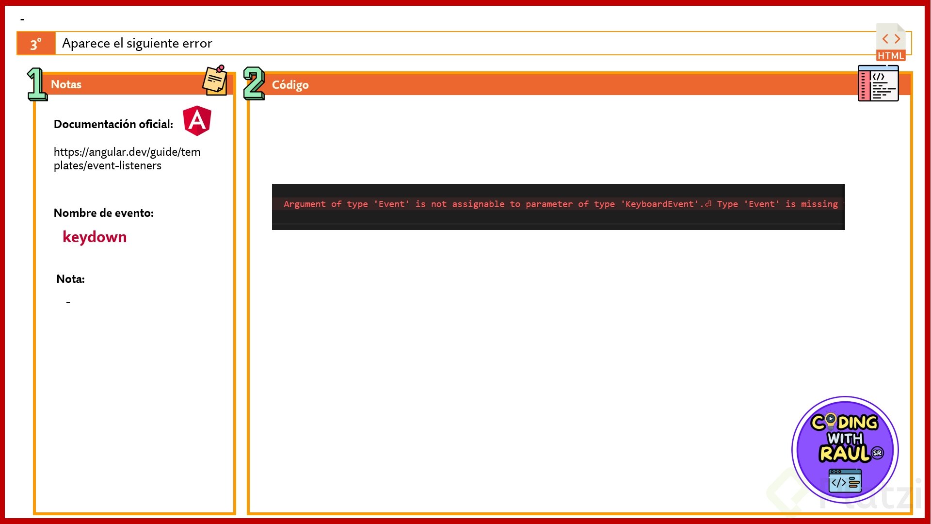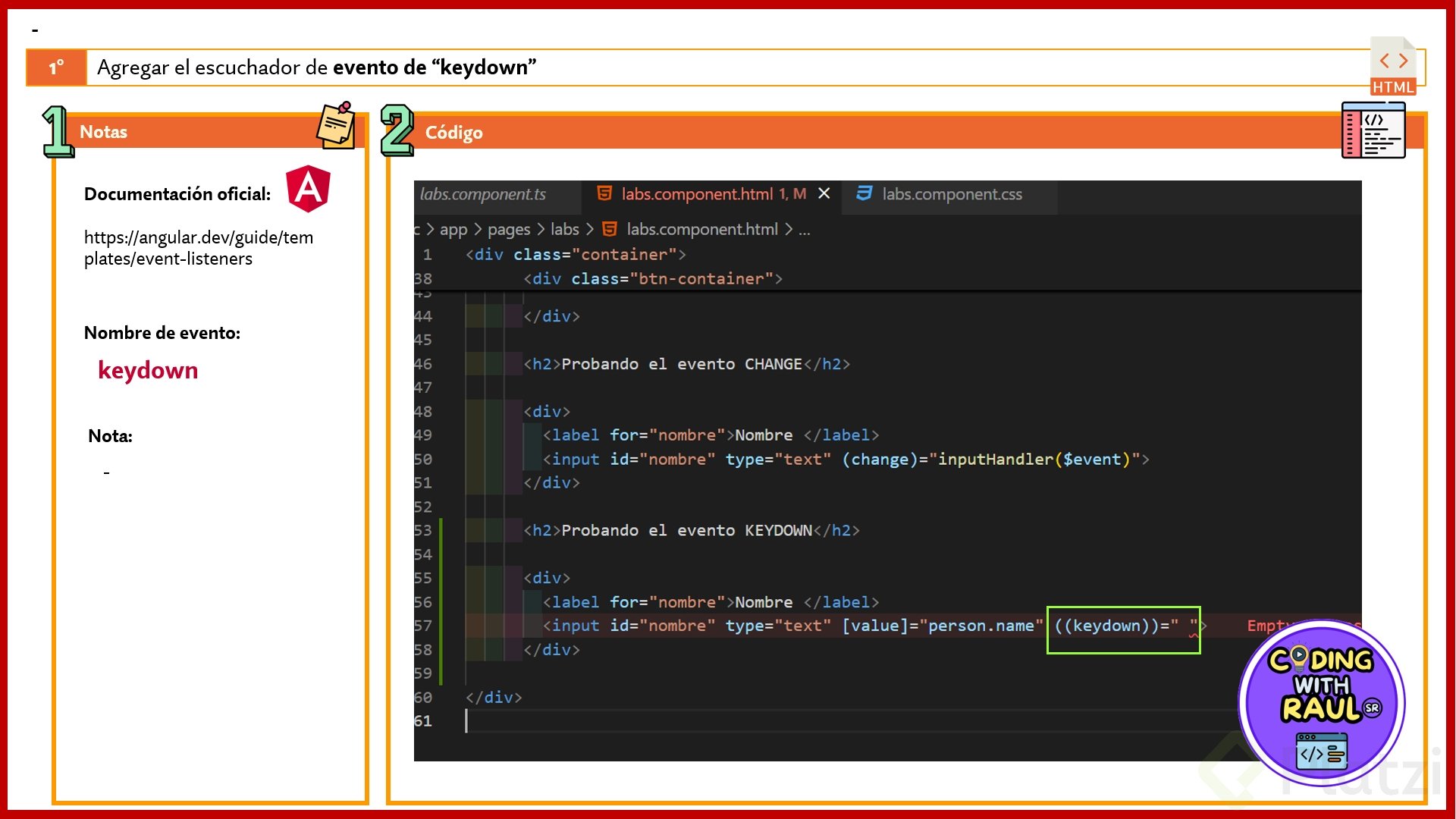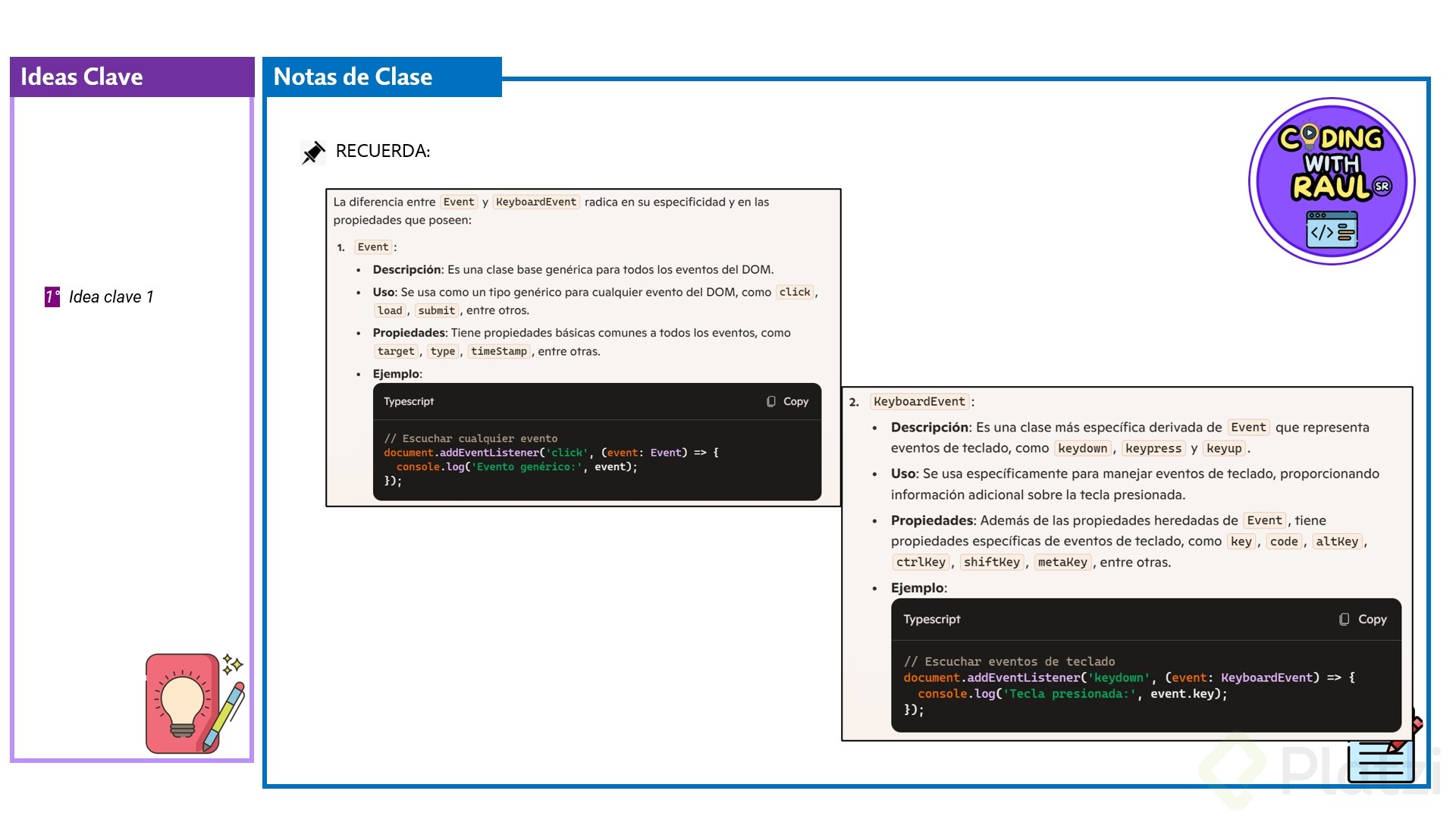 - keydown: Este evento se dispara en el momento en que el usuario presiona una tecla. Es muy útil para detectar la acción en tiempo real y es uno de los eventos más utilizados.