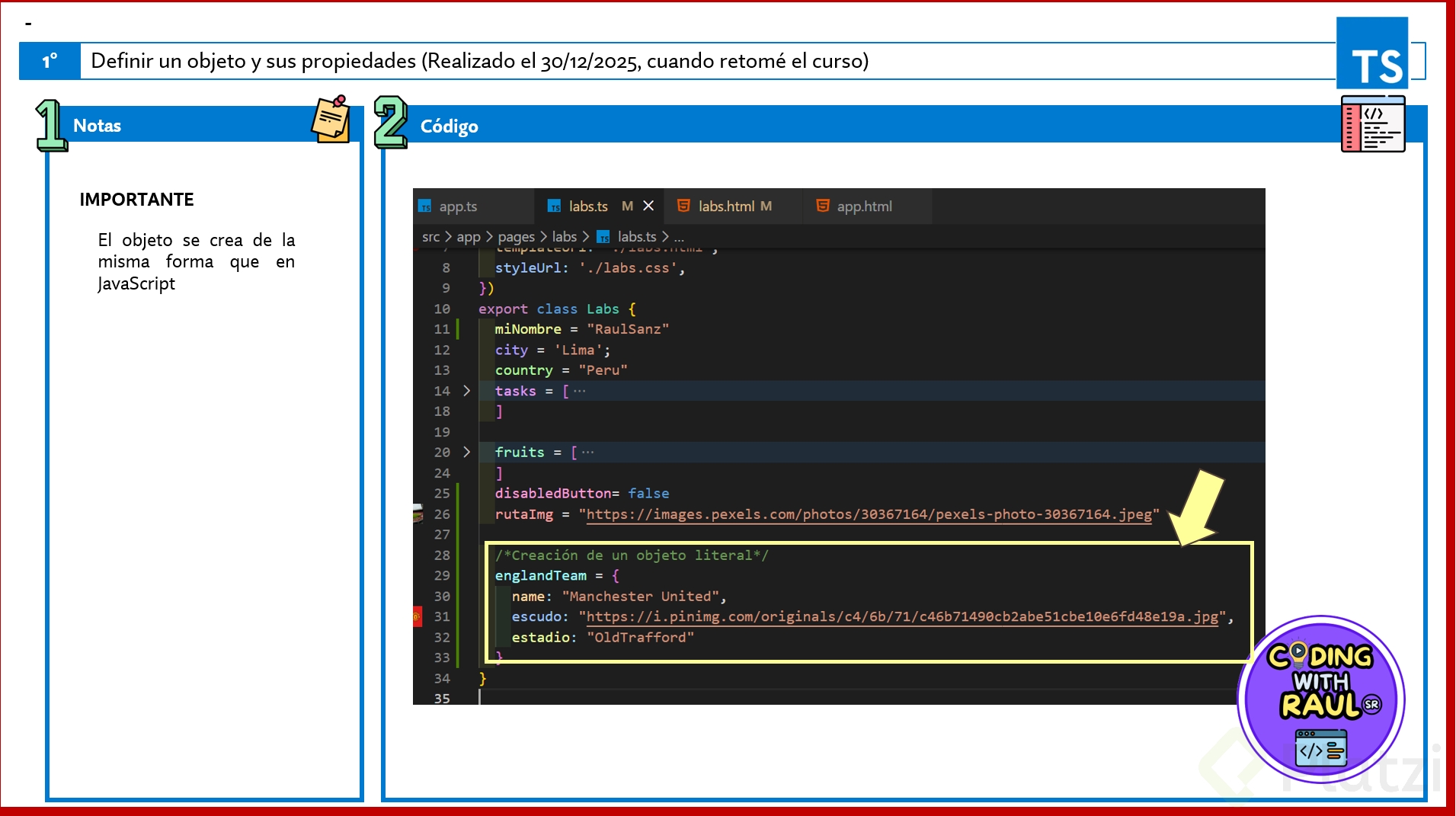 El trabajo con objetos es frecuente en el frontend. Puedes definir un objeto y acceder a sus propiedades para manipular elementos HTML.