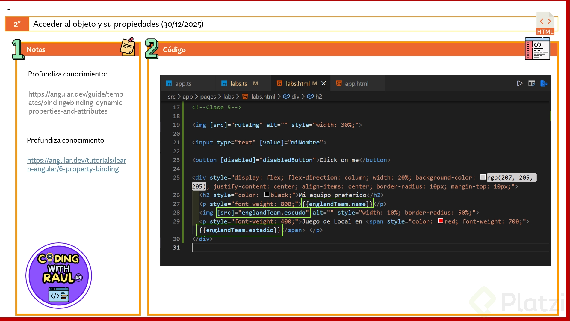 Puedes acceder a sus propiedades a través del Property Binding y la interpolación de strings: