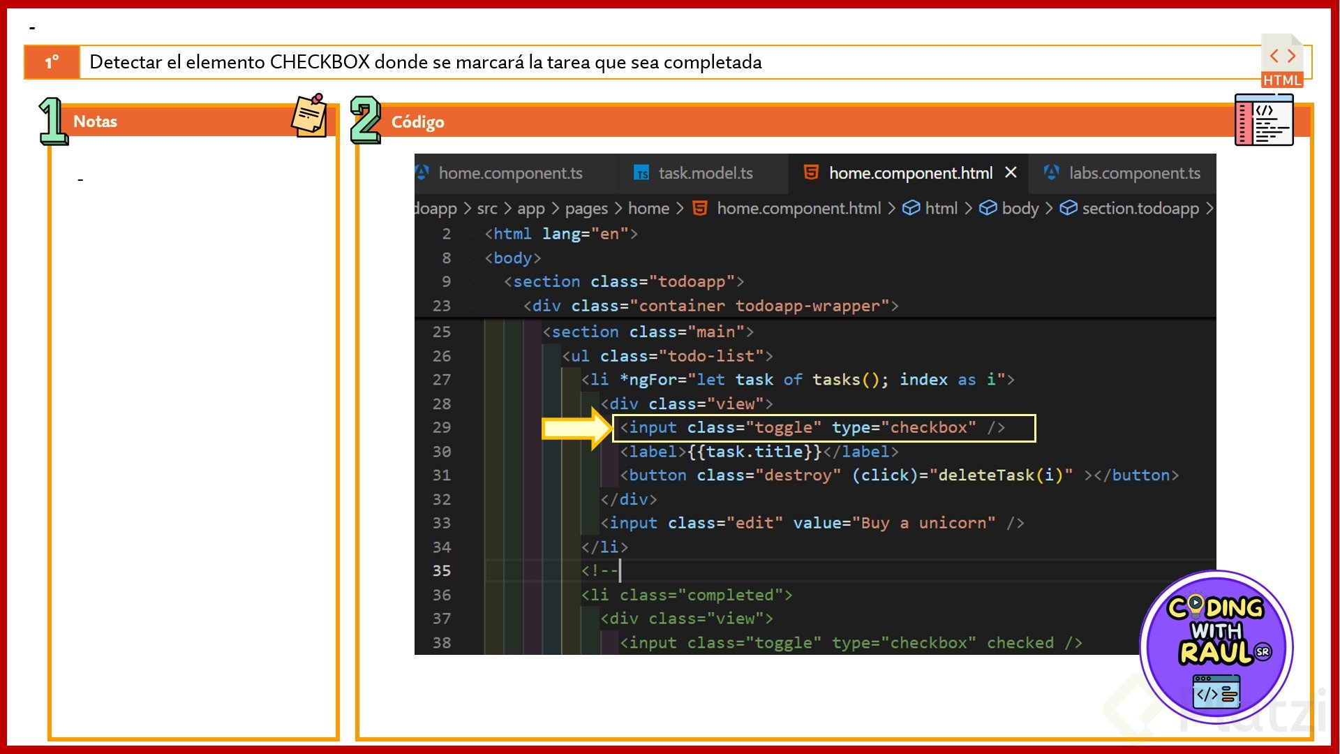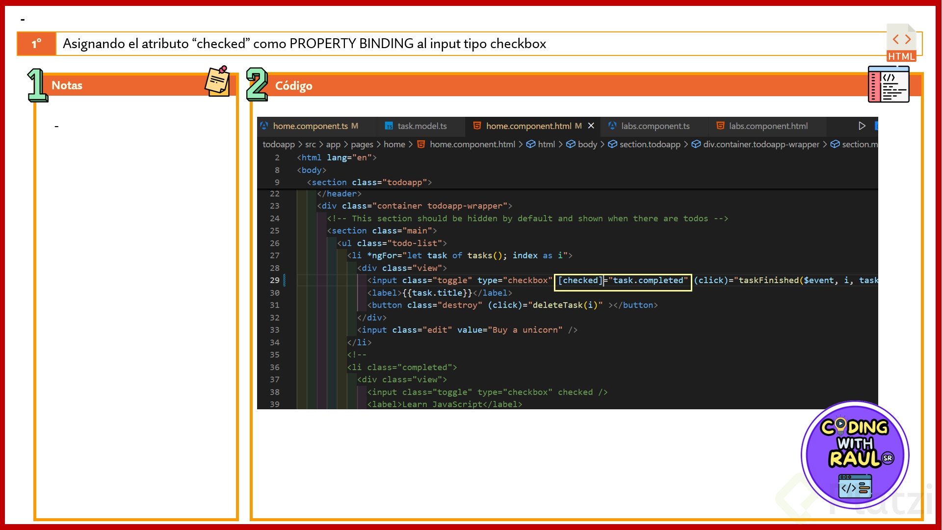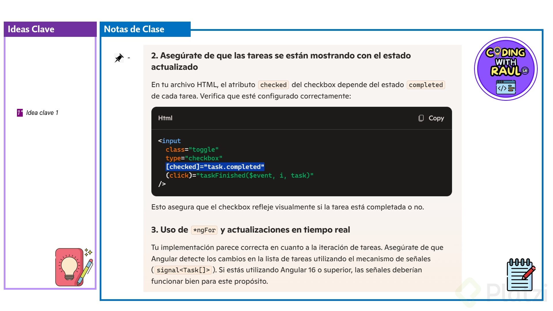 <input type="checkbox" [checked]="task.completed" (change)="updateTags(i)"> - Iteración y visualización: Utilizar un