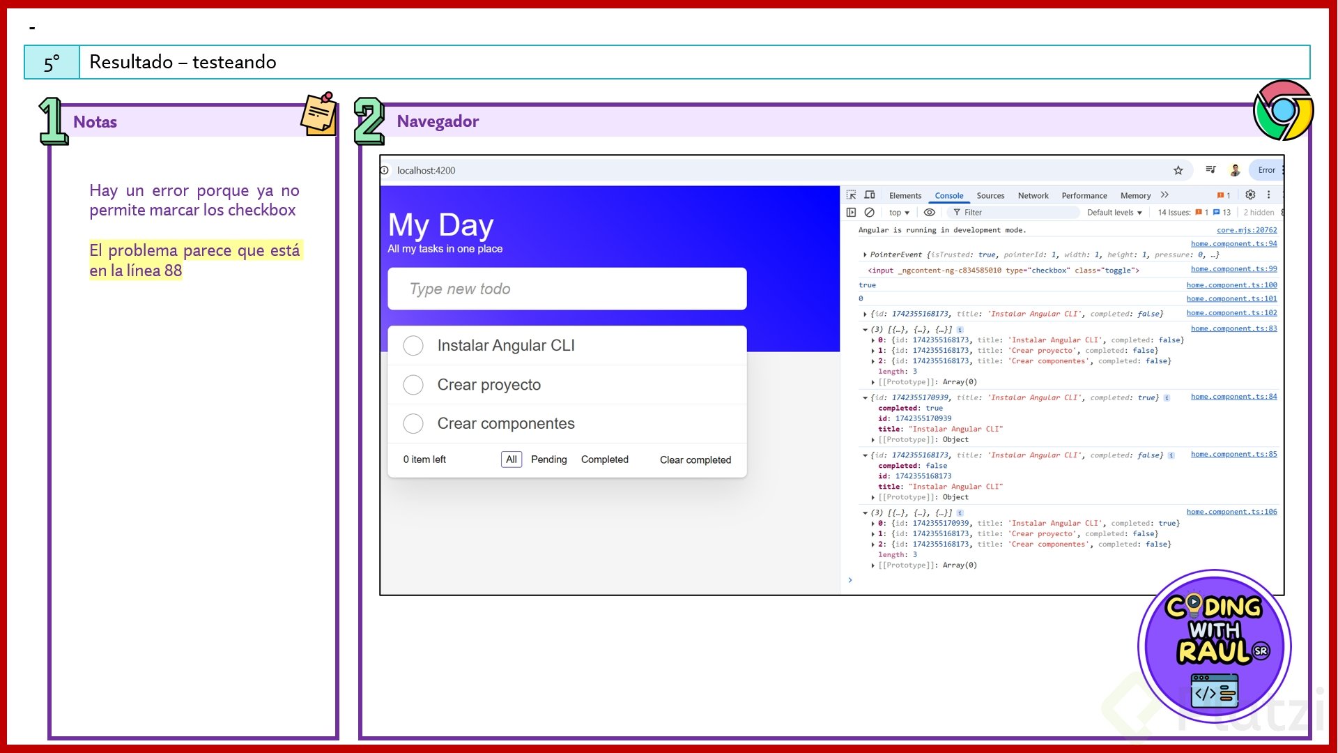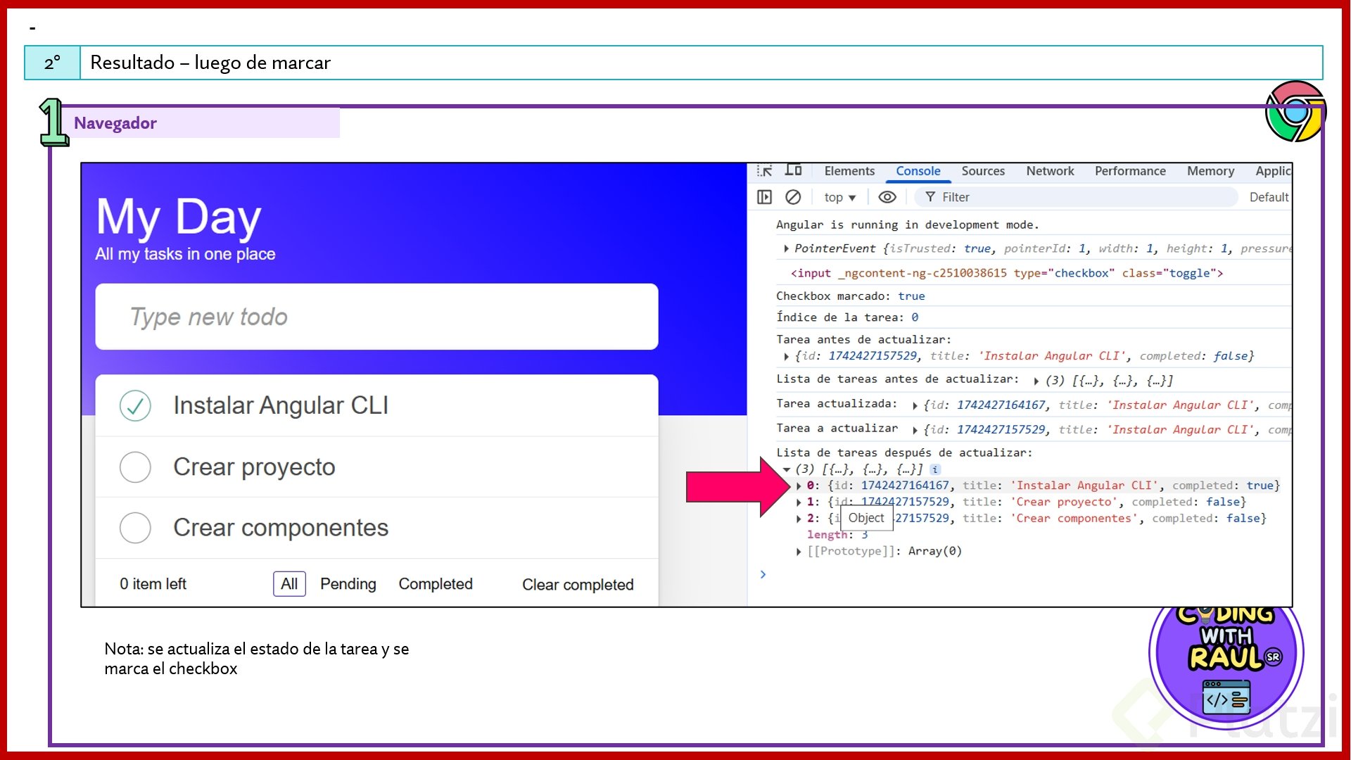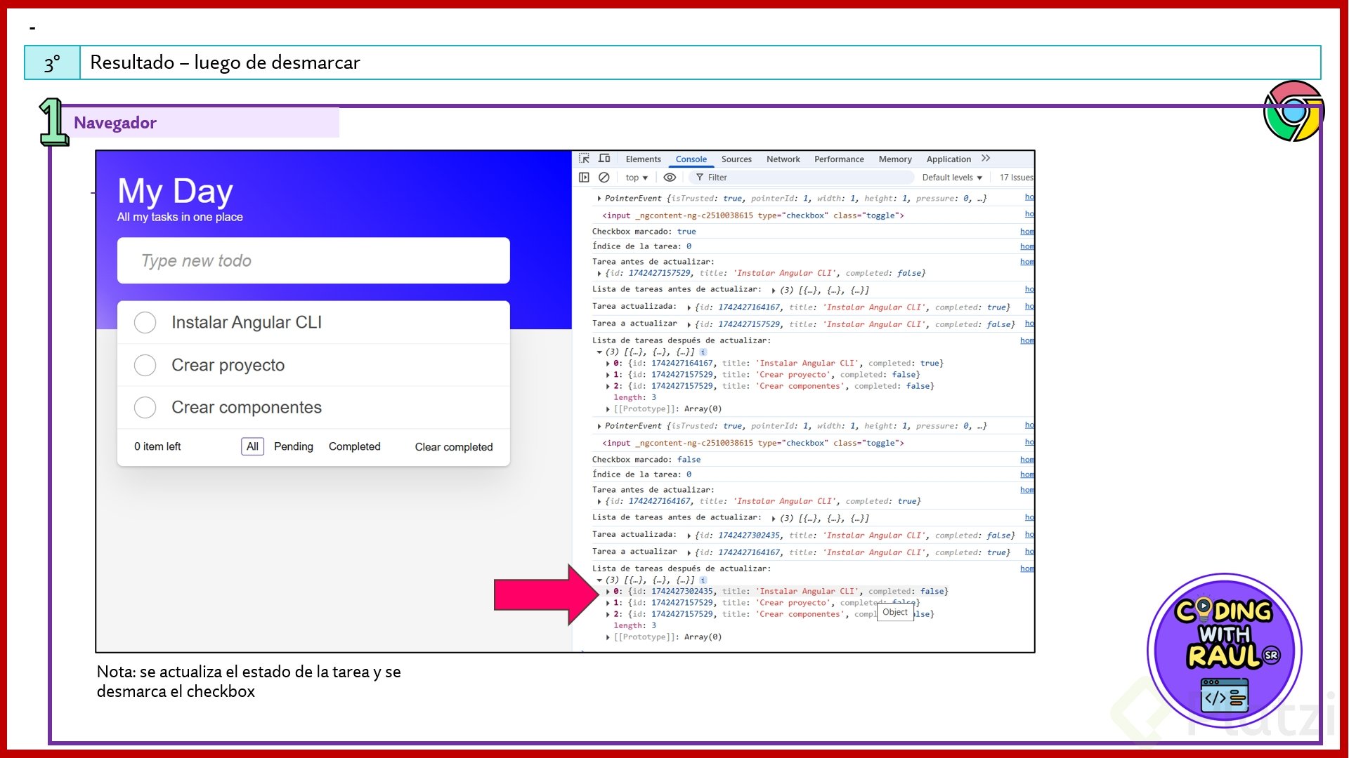 Esta simple adición permite que el estado de la lista de tareas se renderice de forma clara en el navegador, utilizando un pipe llamado JSON proporcionado por Angular. Esta técnica es muy útil para la depuración.