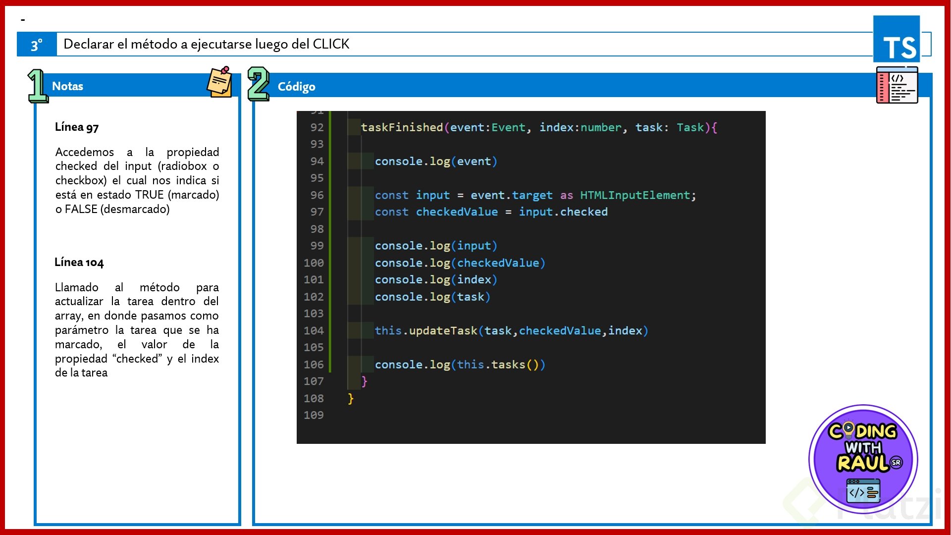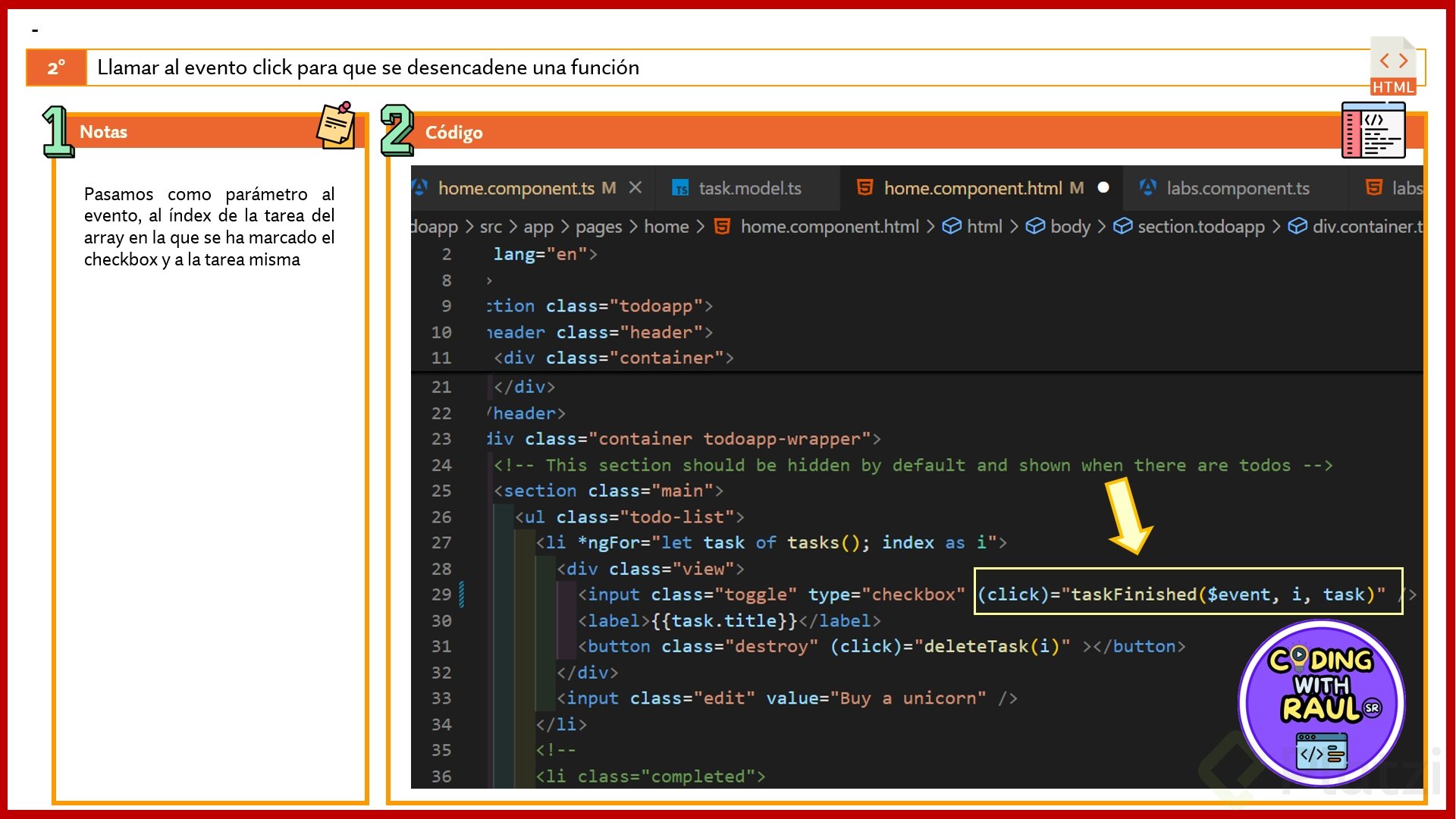 *ngForpara renderizar cada tarea y unchangeevent para ejecutar la funciónupdateTags.