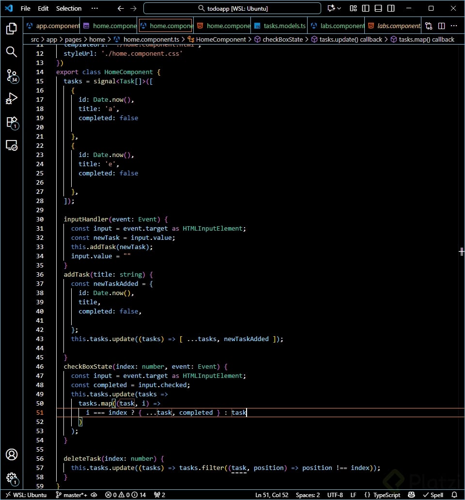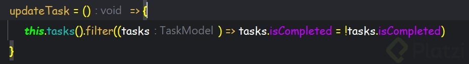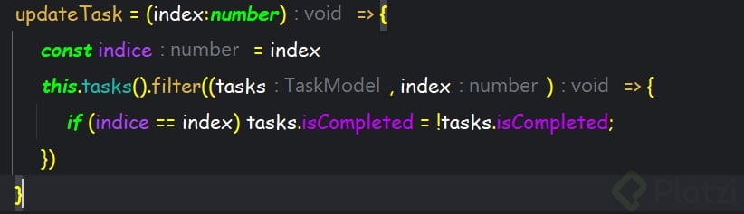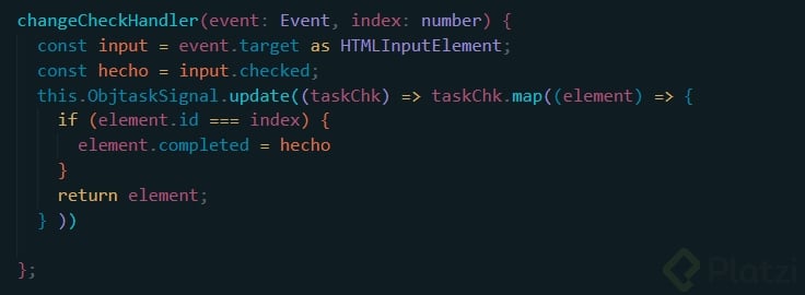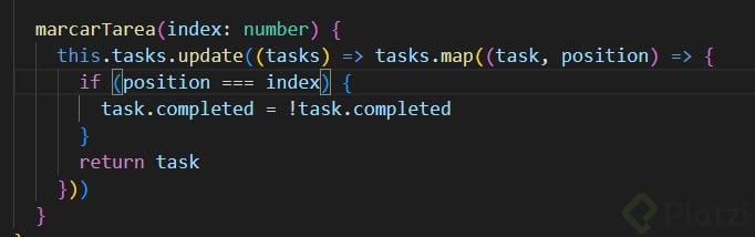 En este código, map recorre todos los elementos del array. Si la posición actual coincide con el índice proporcionado, crea un nuevo objeto de tarea con el estado completed invertido. Esto garantiza que el array original permanezca sin cambios.