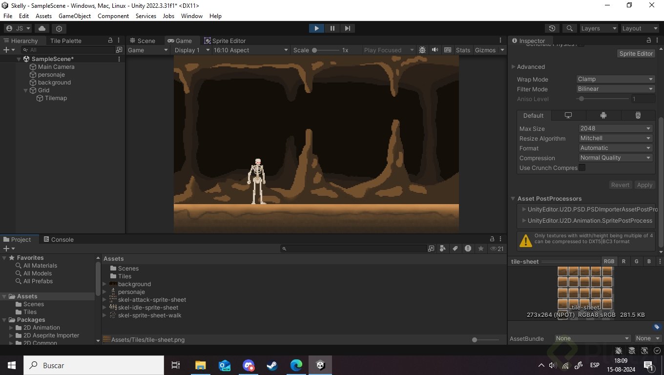 - Verifica el tamaño del tile seleccionado y ajústalo a los píxeles exactos en Unity.