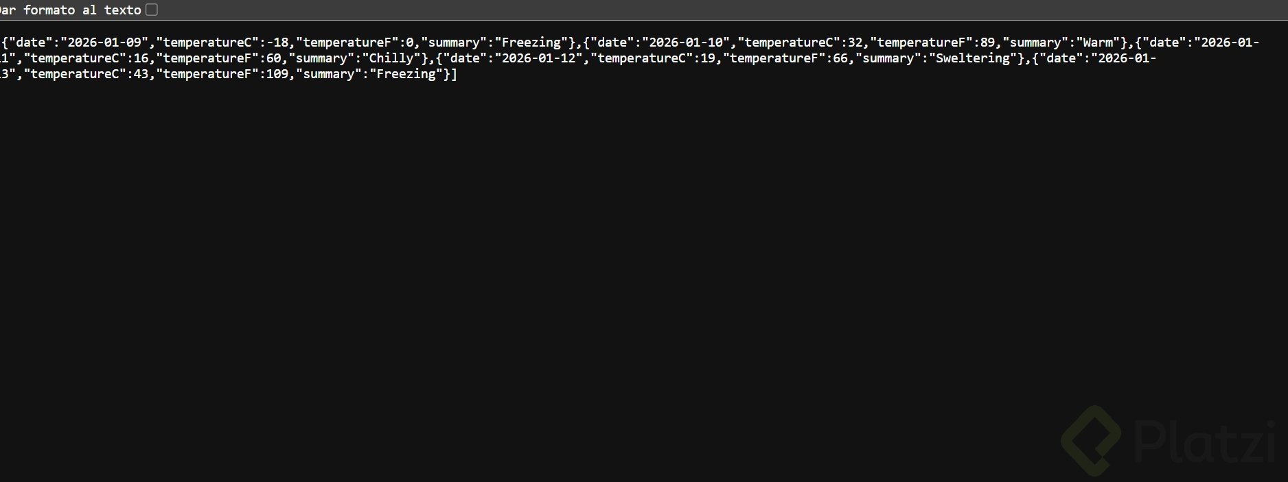 Abre el navegador y navega al controller de weather forecast para ver los datos de ejemplo.
