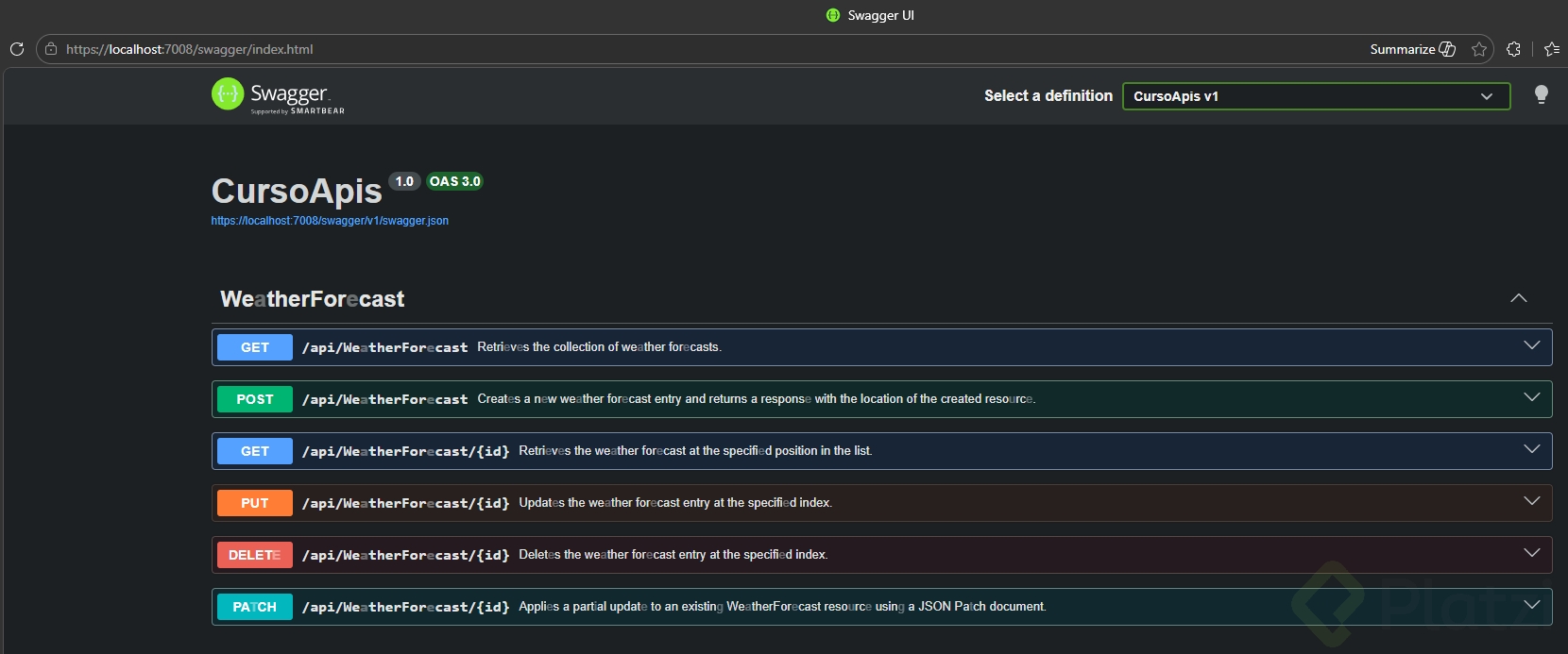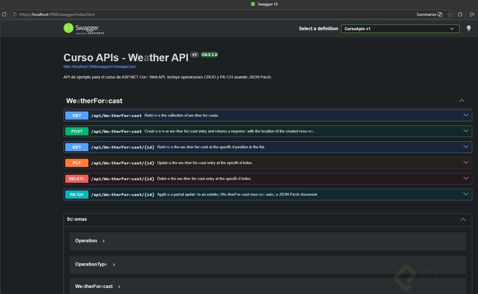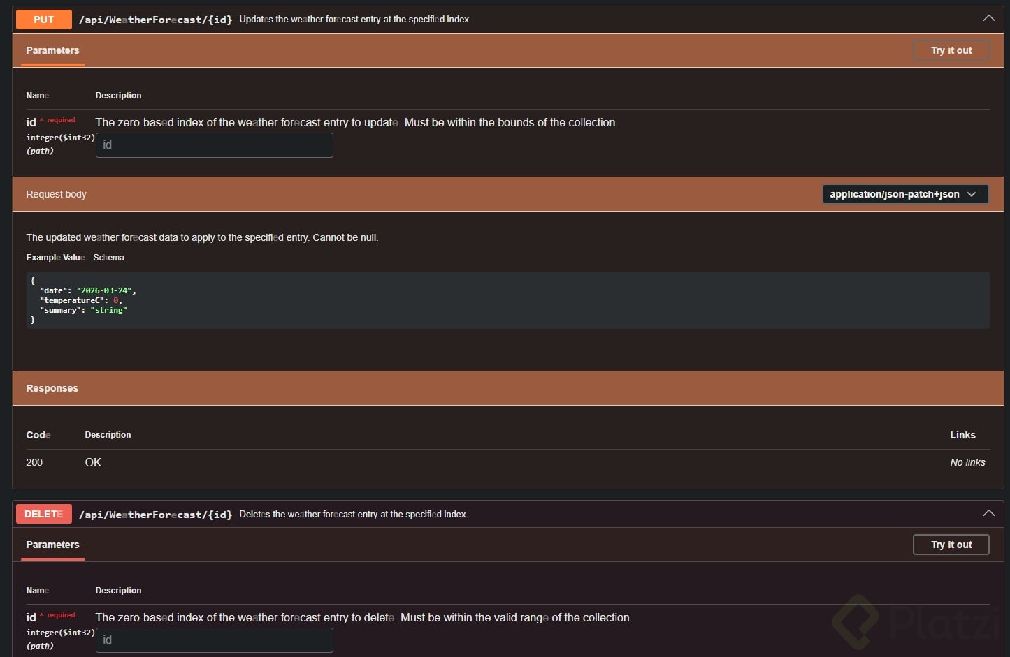 Con esto, verás en Swagger UI descripciones como “Return all weather forecasts” y detalles de parámetros (por ejemplo, que “id” representa una “position”).
